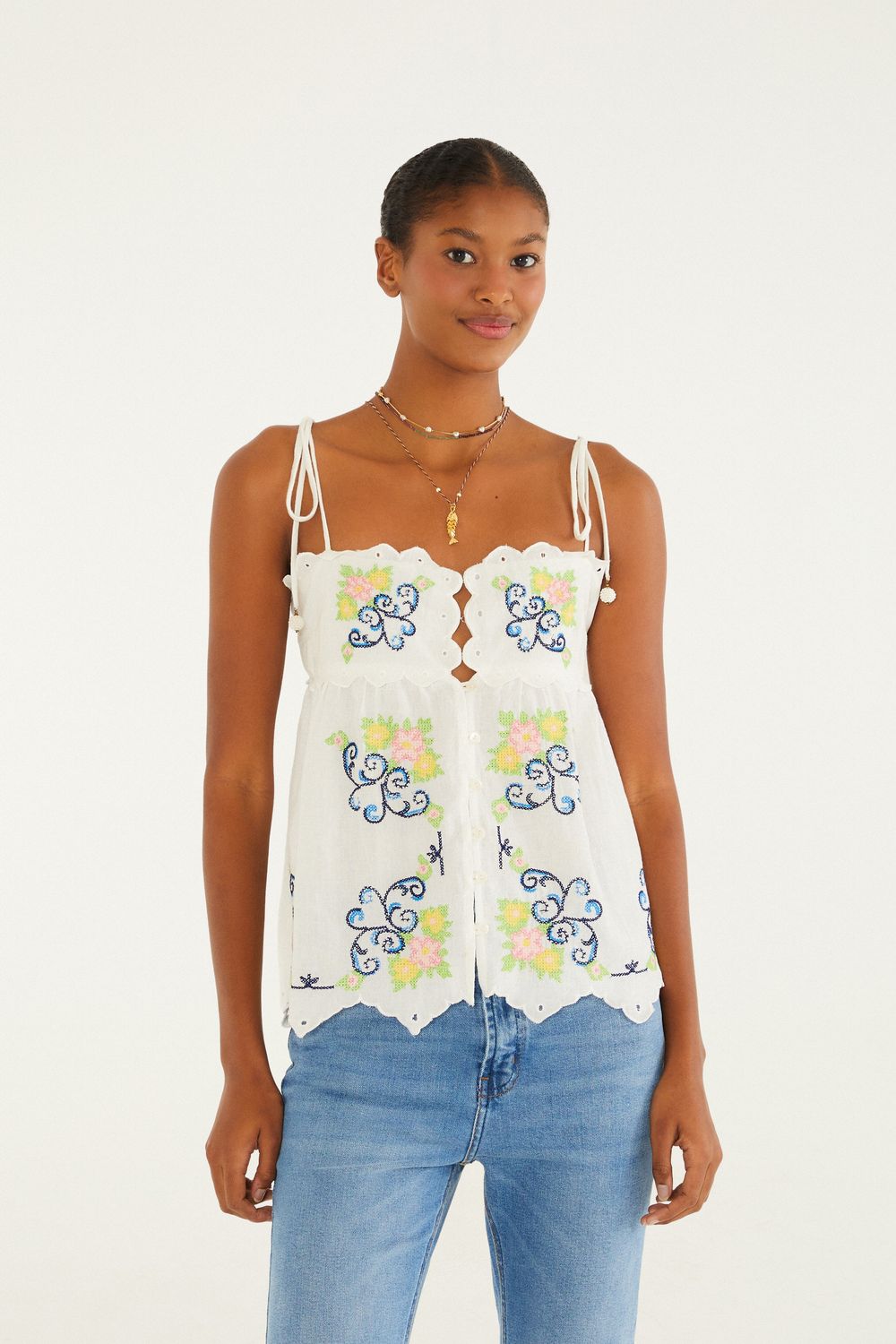 bata bordada borda bandana. alças finas ajustáveis e decote reto, destacando a delicadeza dos bordados. corpo soltinho com acabamento em borda de bandana, oferecendo um toque casual e leve ao visual. perfeita para dias ensolarados e encontros ao ar livre. FARM RIO original - alto verão 26.-