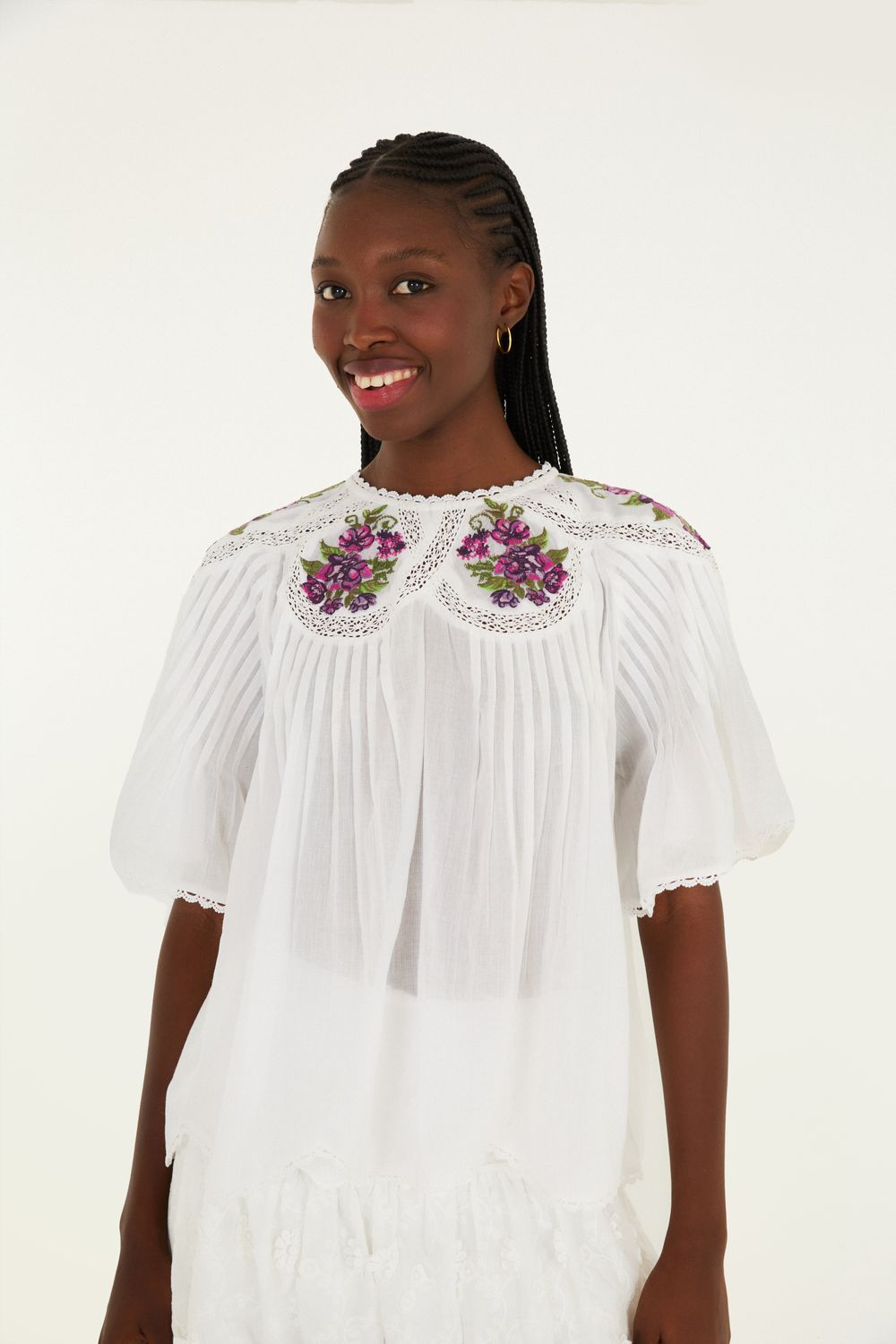 bata bordada poesia de flor. com decote arredondado e mangas curtas, a peça destaca-se pelo bordado delicado no busto e nos ombros, trazendo detalhes únicos e inspiradores. a modelagem solta proporciona conforto e leveza, sendo perfeita para ocasiões casuais e momentos especiais. FARM RIO original - verão 26.-
