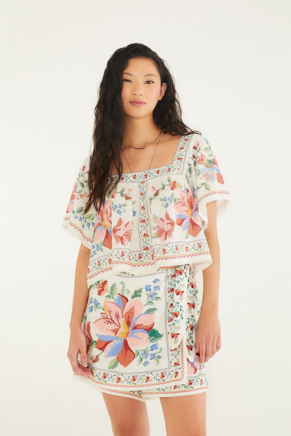 bata estampada brisa serena. possui decote quadrado e mangas soltas que caem suavemente sobre os ombros, proporcionando leveza. modelagem solta, com detalhes de acabamento delicados que elevam seu charme. ideal para passeios ao ar livre e encontros casuais, trazendo alegria e frescor a cada uso. FARM RIO original - alto verão 26.-
