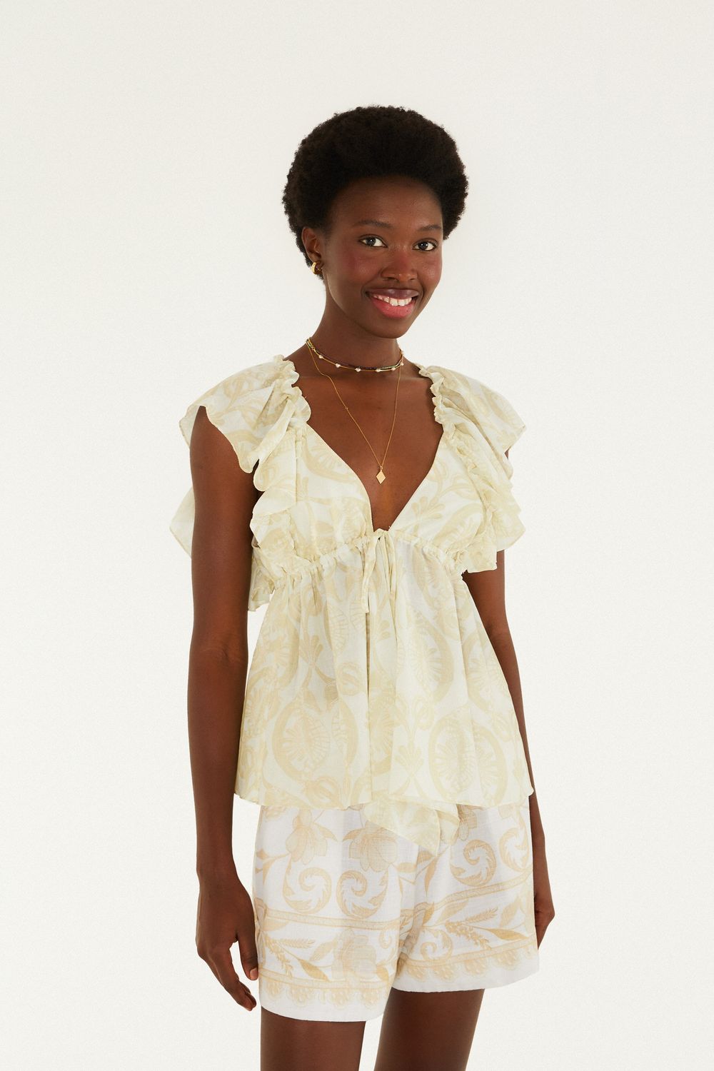 bata estampada cavalos marinhos. com decote em v e tiras para ajuste delicado, essa peça é um convite para momentos casuais ao ar livre. suas mangas curtas com babados conferem um charme atual e fresco. a modelagem fluida proporciona conforto, tornando-a ideia para dias ensolarados com muito estilo. FARM RIO original - alto verão 26.-