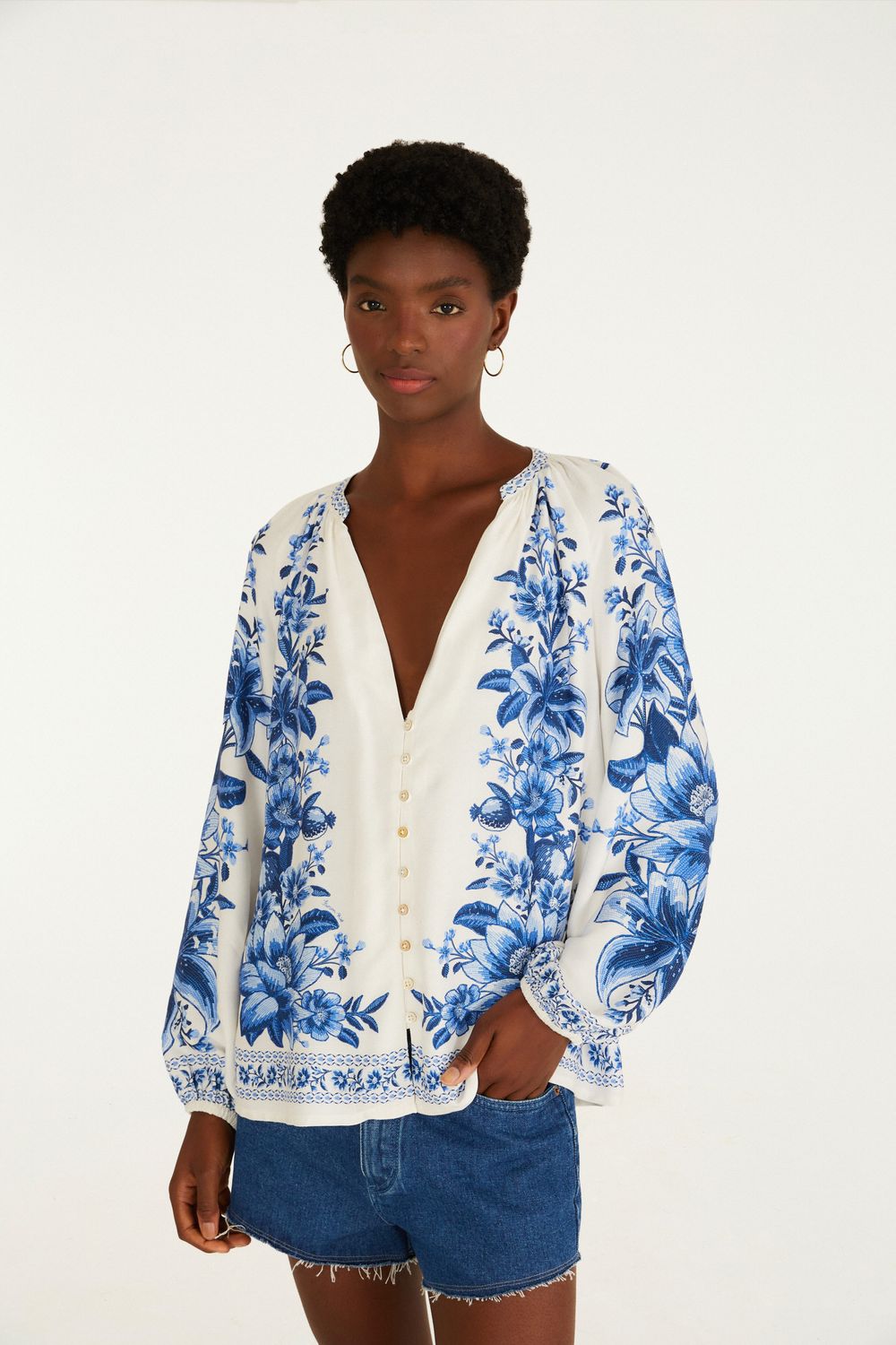 bata fruta de verão. traz um decote em v profundo com uma linha de botões que adicionam um charme único. as mangas longas e soltas criam uma sensação de leveza e movimento. perfeita para um passeio casual ou um encontro especial, essa peça combina estilo e conforto de maneira única. FARM Rio, coleção Carioca - inverno 26.-