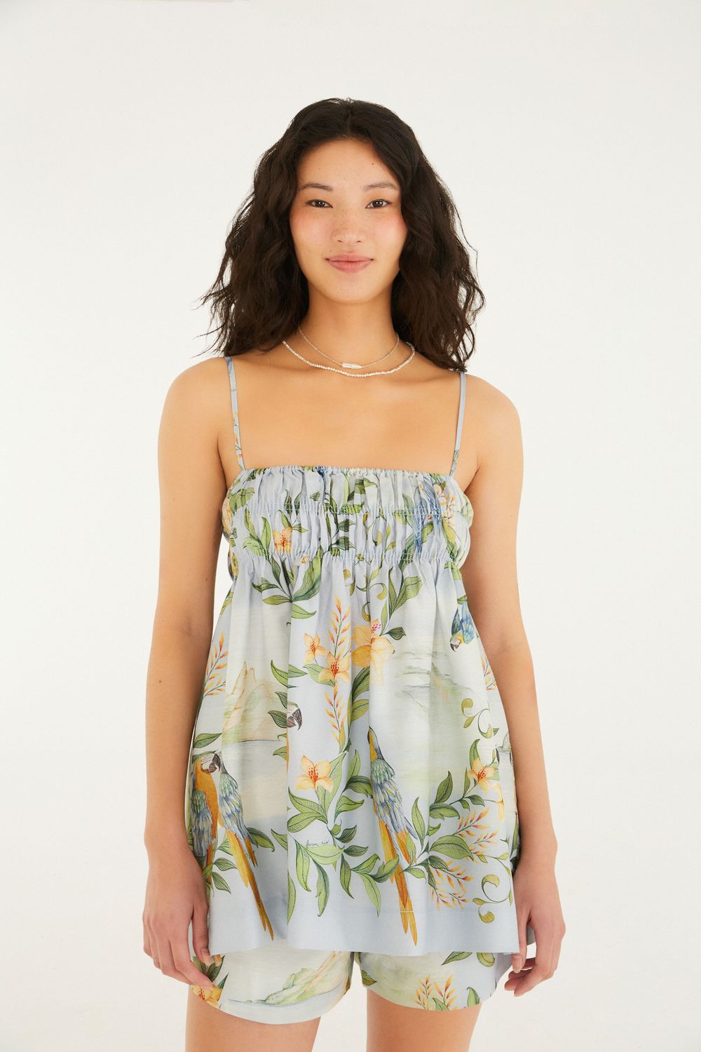 bata paisagem rio é um convite ao frescor com suas alças finas e corte fluido. o decote reto e franzido traz charme e leveza, ideal para dias casuais ou um passeio à beira-mar. a estampa única ressalta a criatividade e originalidade da marca. perfeita para combinar com shorts ou saias, essa peça eleva o seu dia a dia com um toque especial. FARM Rio, coleção Carioca - inverno 26.-