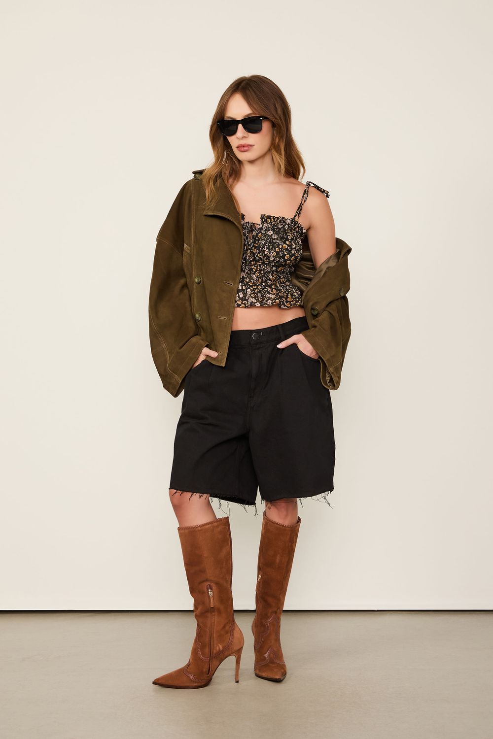 Bermuda de Sarja com shape oversized, bolsos, pregas frontais, cintura média, barra desfiada, passantes e botão metálico no cós. A matéria-prima moderna ganha destaque nas produções da estação.