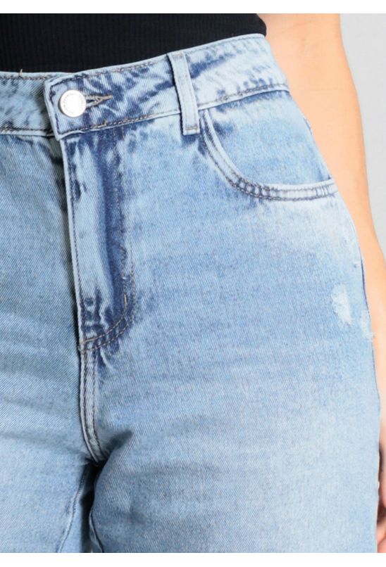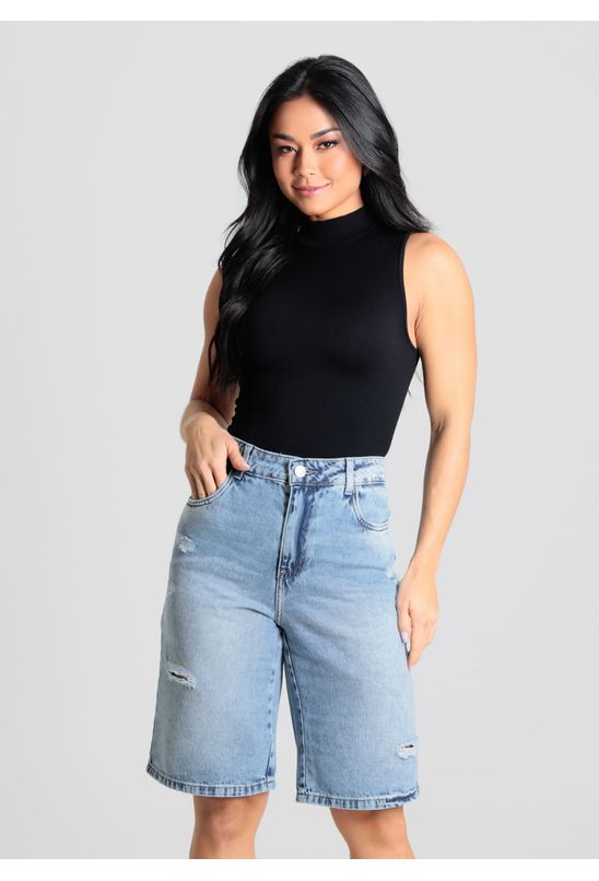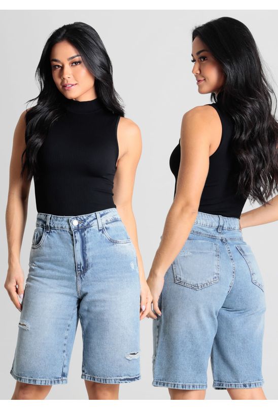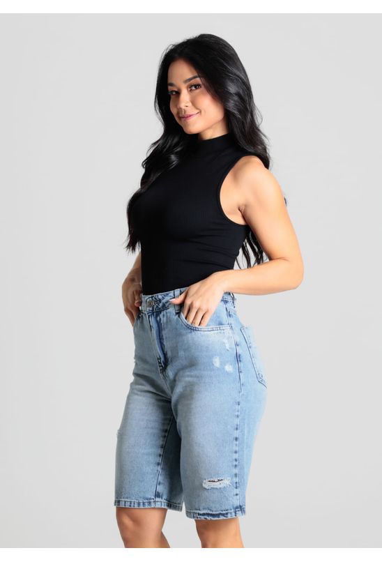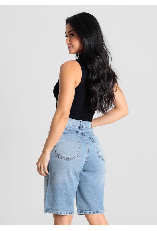 Bermuda confeccionado em jeans. Modelagem moderna e confortável para todas as ocasiões. Cintura alta Fechamento com botão e zíper Bolsos frontais falsos e posterior funcionais Barra simples Tecido: Jeans Tipo de lavagem: Azul Cor: Azul media-