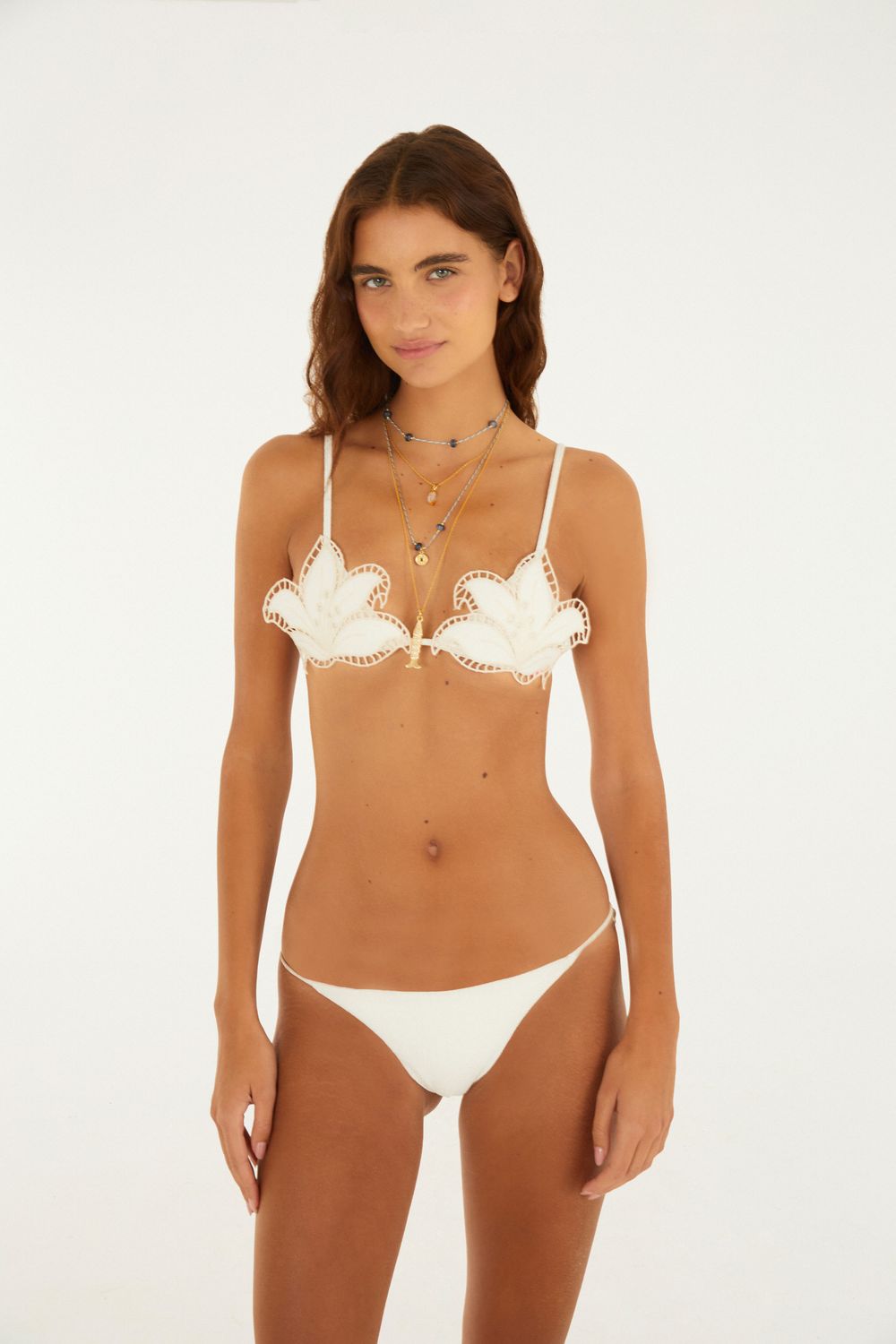 biquini artesanal flor Richelieu. desenvolvido artesanalmente, destaca-se pelas finas alças ajustáveis e delicadas flores em Richelieu no busto, conferindo um charme único. a calcinha de modelagem clássica completa o conjunto, ideal para um dia relaxante à beira-mar. FARM Rio, coleção Carioca - inverno 26.-