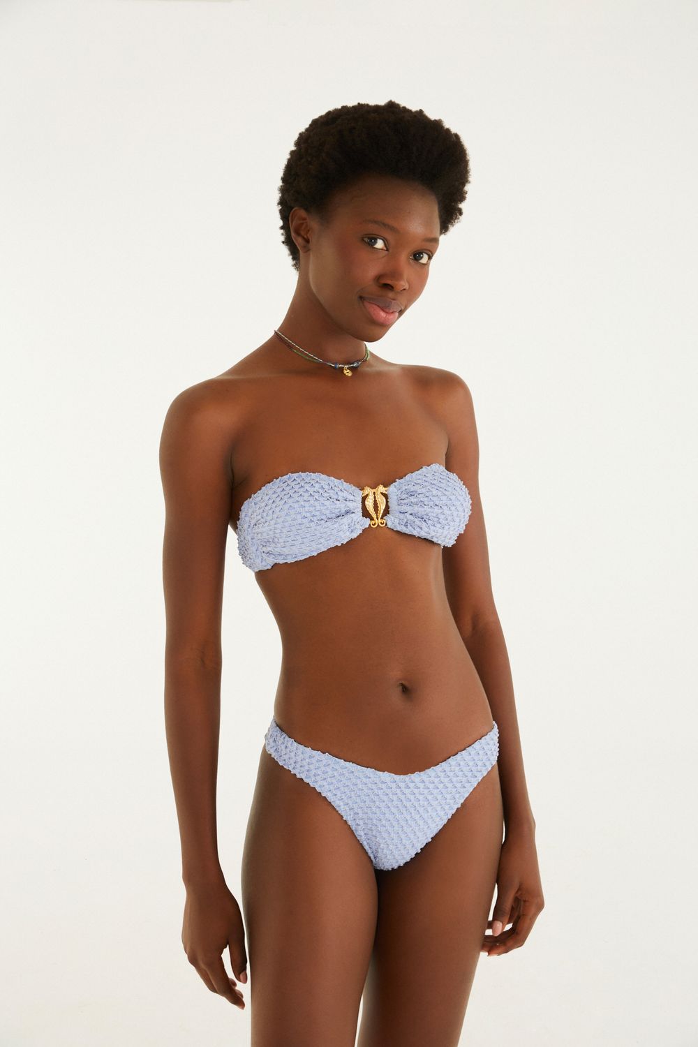 biquini asa delta textura cavalo marinho. top sem alças com detalhe central em metal que cria um efeito drapeado, com amarração nas costas. a calcinha asa delta oferece conforto e estilo único. perfeito para um dia na praia ou na piscina, proporciona um visual moderno e descomplicado. FARM Rio, coleção Carioca - inverno 26.-