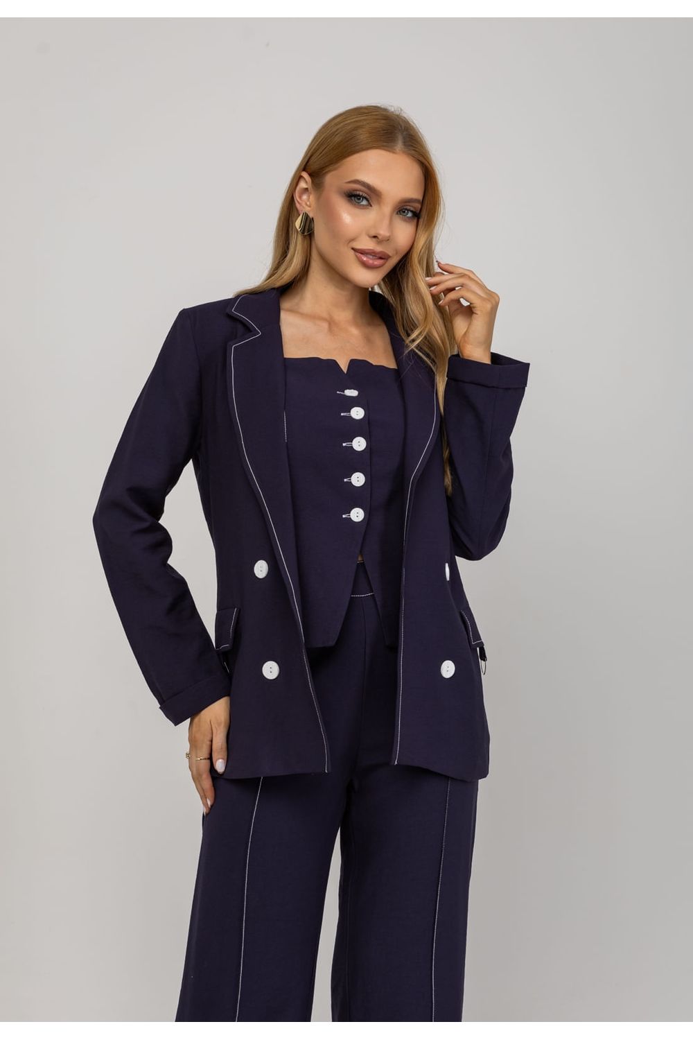 A lapela é clássica, no estilo de blazer tradicional, com acabamento em costura contrastante que percorre toda sua borda, destacando-se sobre o fundo do tecido.