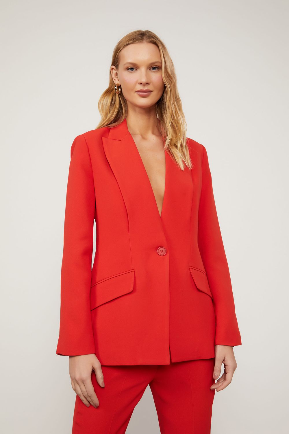 O Blazer Vermelho é ideal para uma alfaiataria sofisticada. Possui lapela, mangas longas, ombreiras, bolsos e fechamento frontal com botão. O modelo com comprimento clássico possui ótimo caimento com recortes que proporcionam um ajuste natural para a silhueta, e é uma escolha atemporal e versátil que protagoniza looks elegantes, como na versão com a calça na mesma proposta, e acessórios metalizados.
