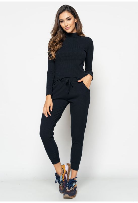 Blusa Gola Alta Manga Longa Malha Canelada Preto