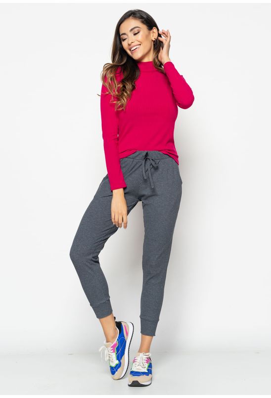 Blusa Gola Alta Manga Longa Malha Canelada Rosa