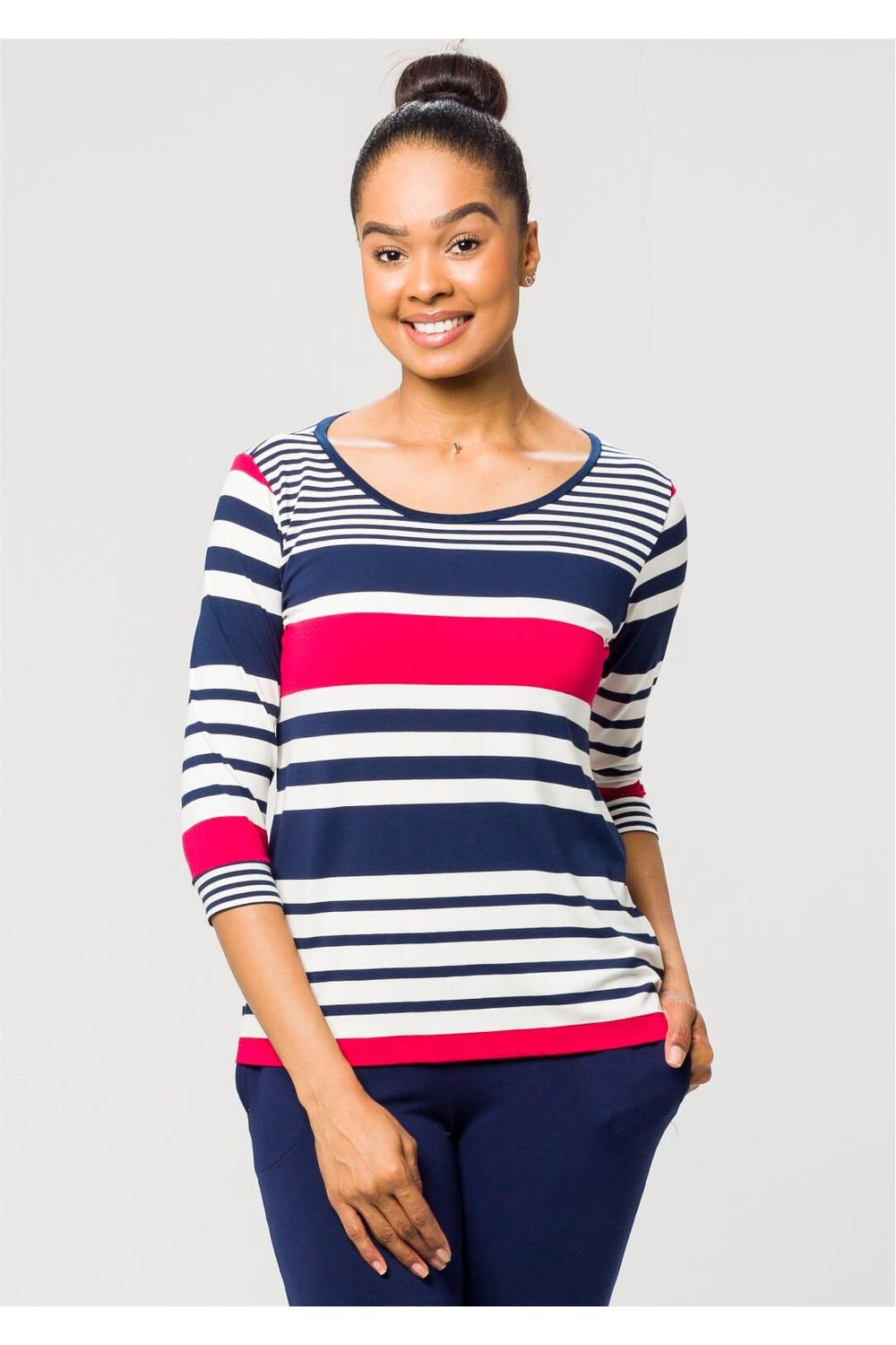 Blusa 3/4 Pau a Pique Listrada Azul Marinho