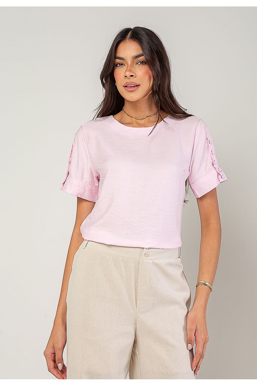 A blusa feminina com botões decorativos na manga é uma peça leve, elegante e perfeita para compor looks modernos com um toque clássico.