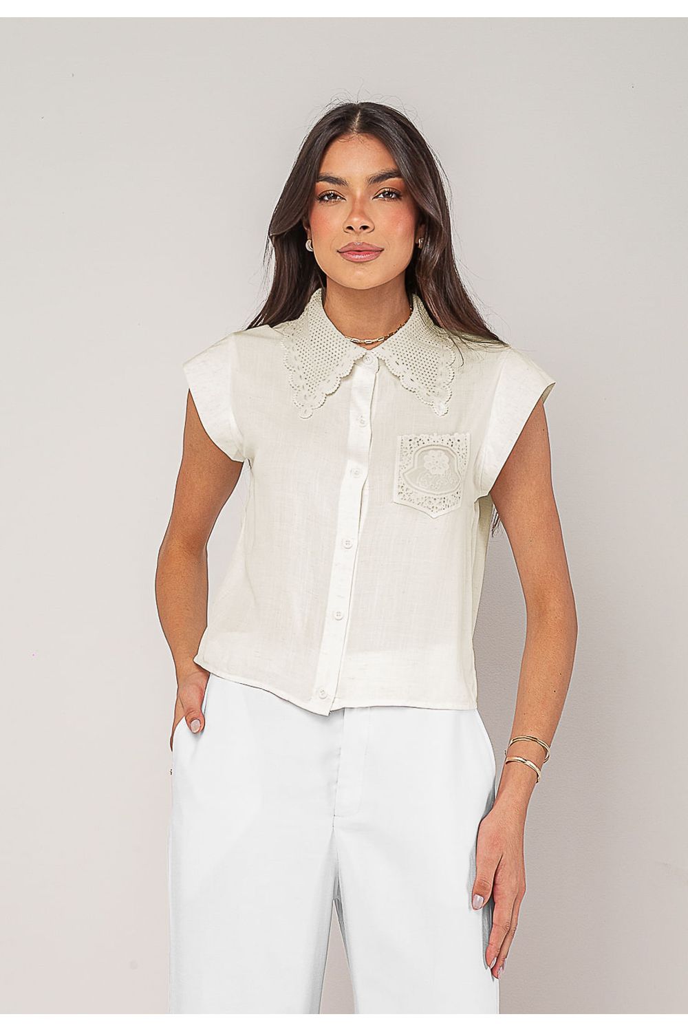 Seu grande destaque é a gola trabalhada em renda perfurada com acabamento em bico, que traz um toque vintage e refinado.