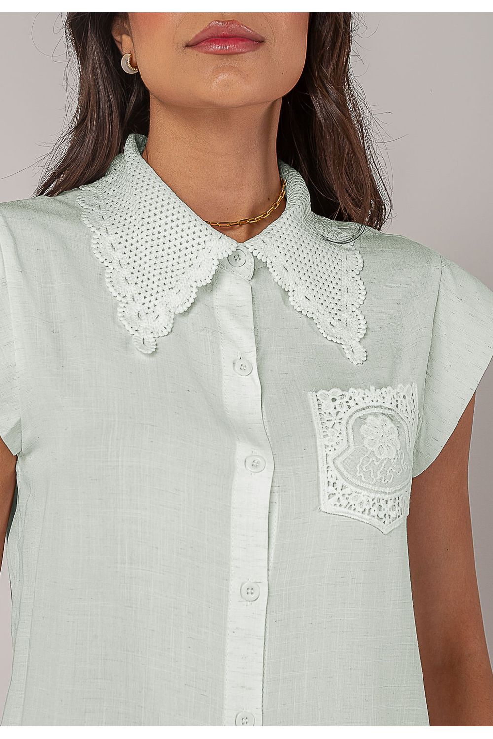 Seu grande destaque é a gola trabalhada em renda perfurada com acabamento em bico, que traz um toque vintage e refinado.