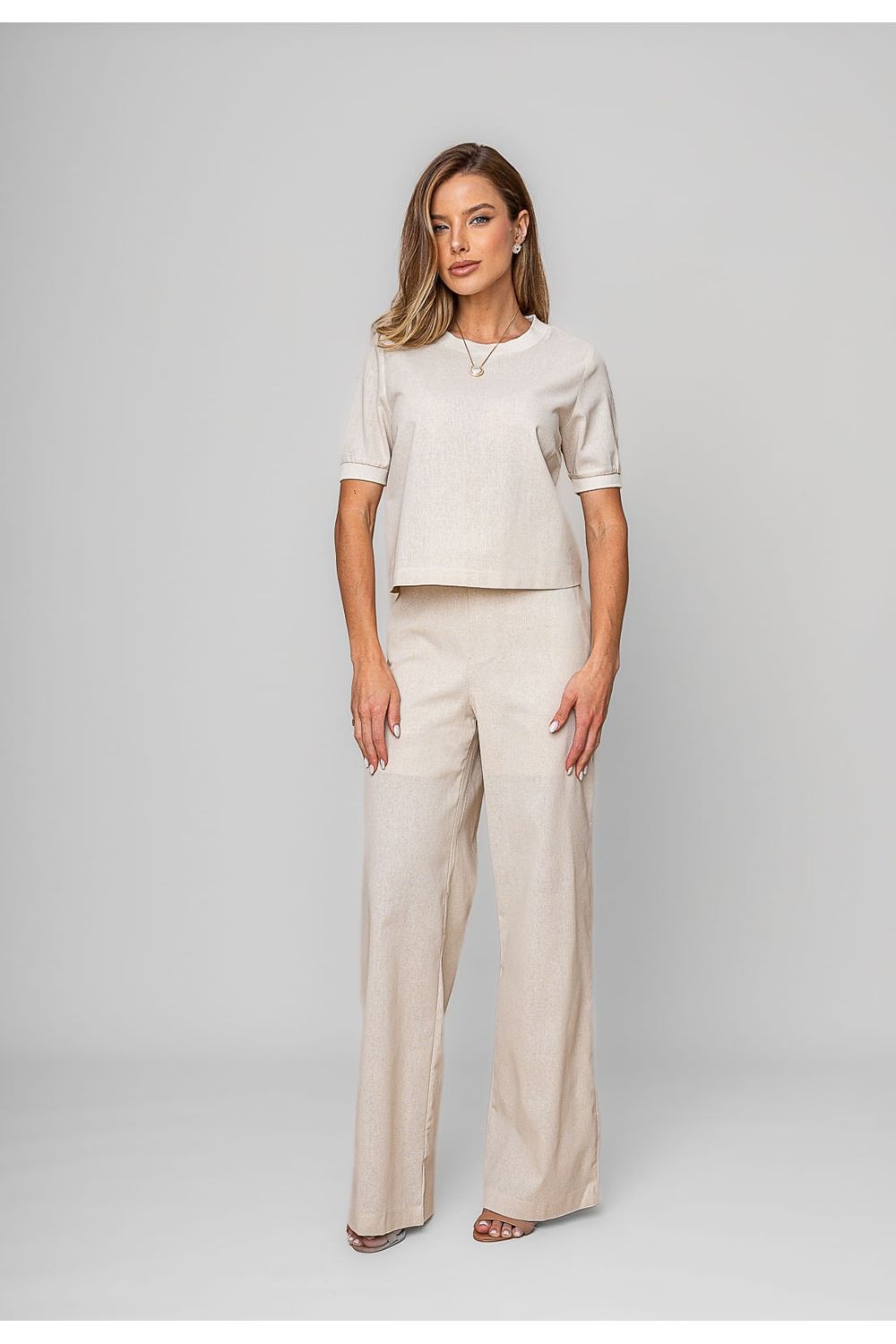 Seu tecido em linho garante um toque suave e leveza no vestir, enquanto a modelagem reta oferece liberdade de movimentos sem perder a elegância. A gola redonda e as mangas curtas com acabamento em ribana adicionam um toque contemporâneo e discreto.