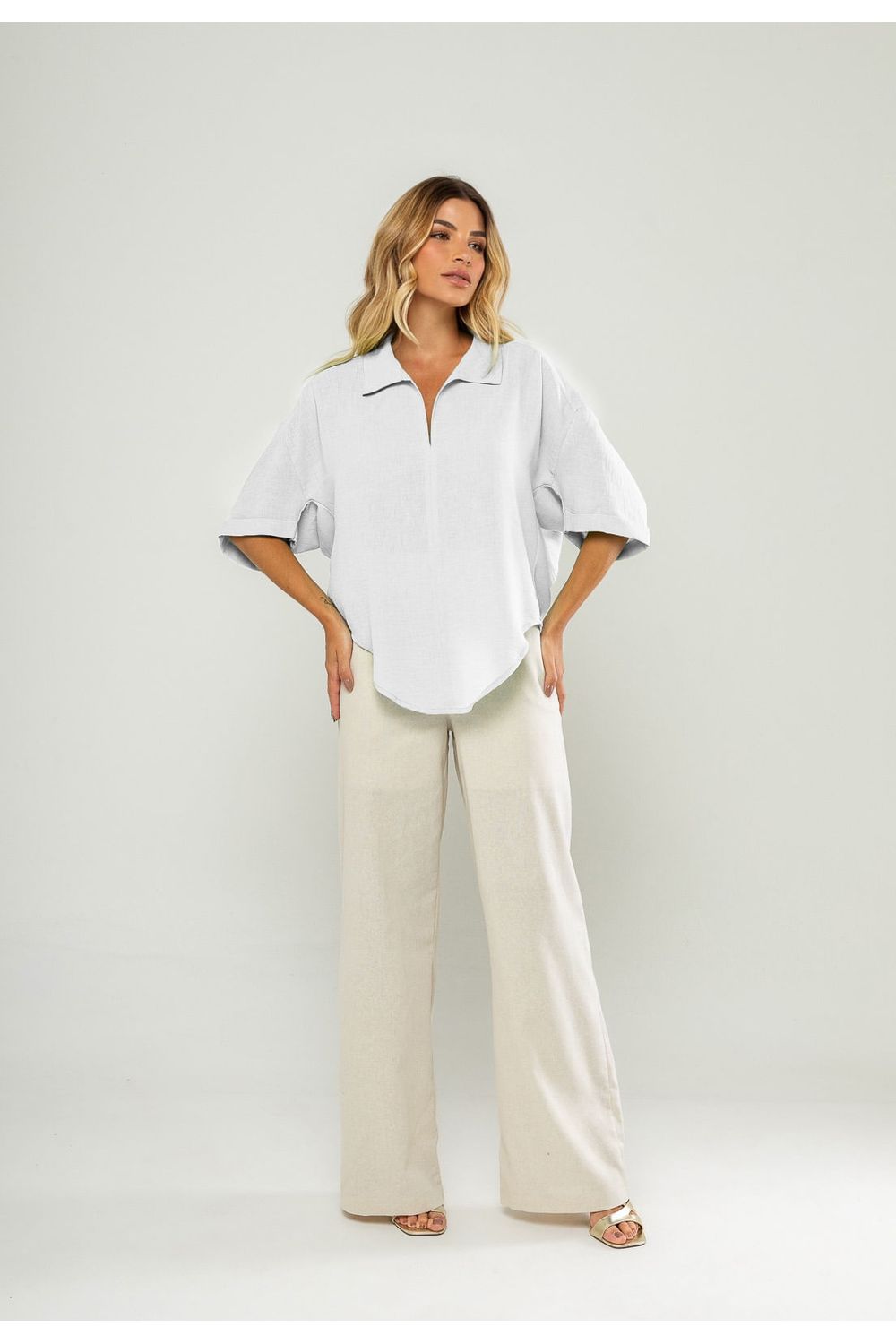 Confeccionada em tecido leve, ela oferece um caimento fluido que veste com elegância e proporciona frescor ao longo do dia.