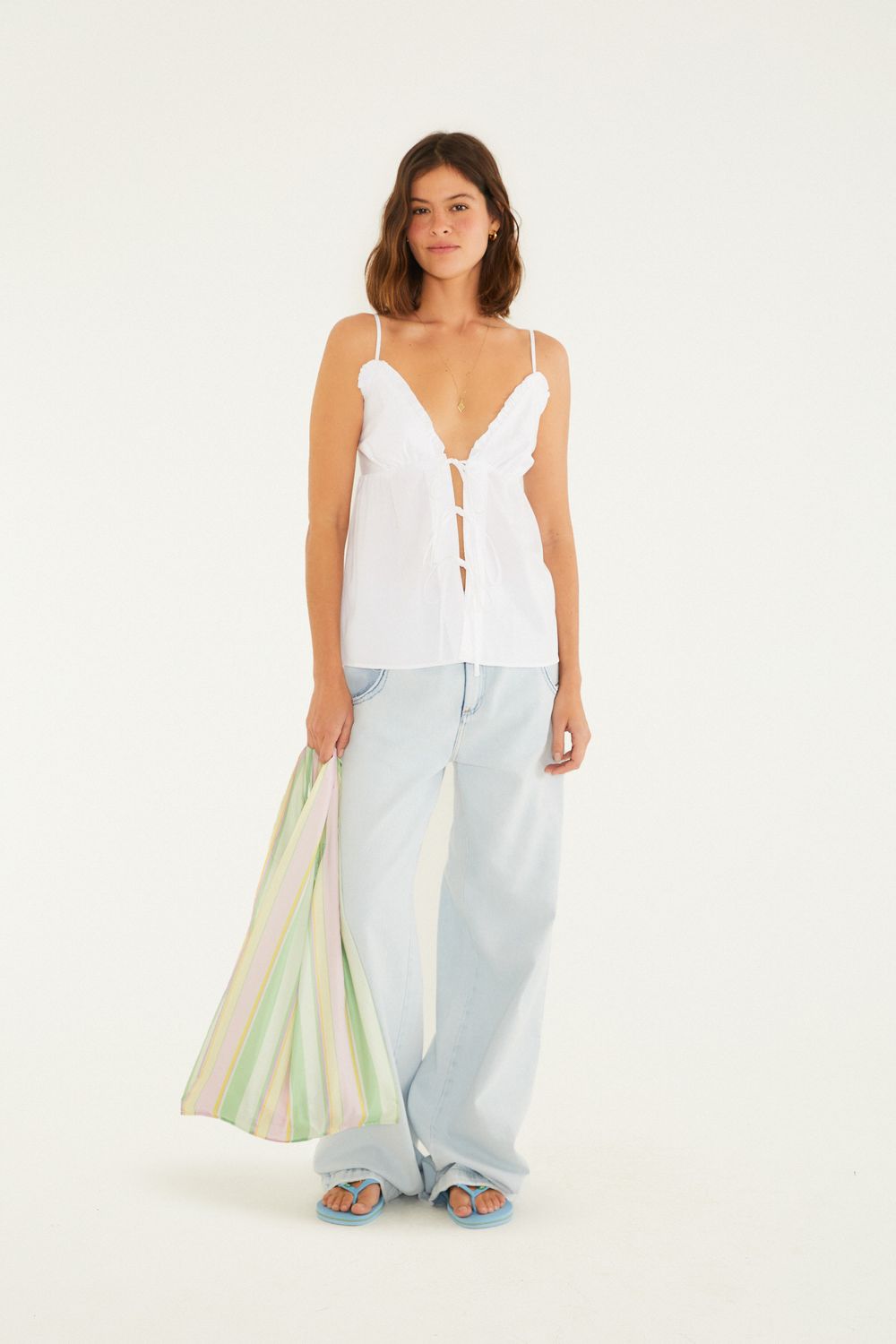 blusa babadinhos alcinhas. com decote em v profundo e amarração frontal, o design é leve e envolvente. as alças finas complementam o caimento solto e delicado, destacando os babados sutis que trazem movimento e charme à peça. ideal para momentos casuais ou passeios ao ar livre. FARM RIO original - alto verão 26.-