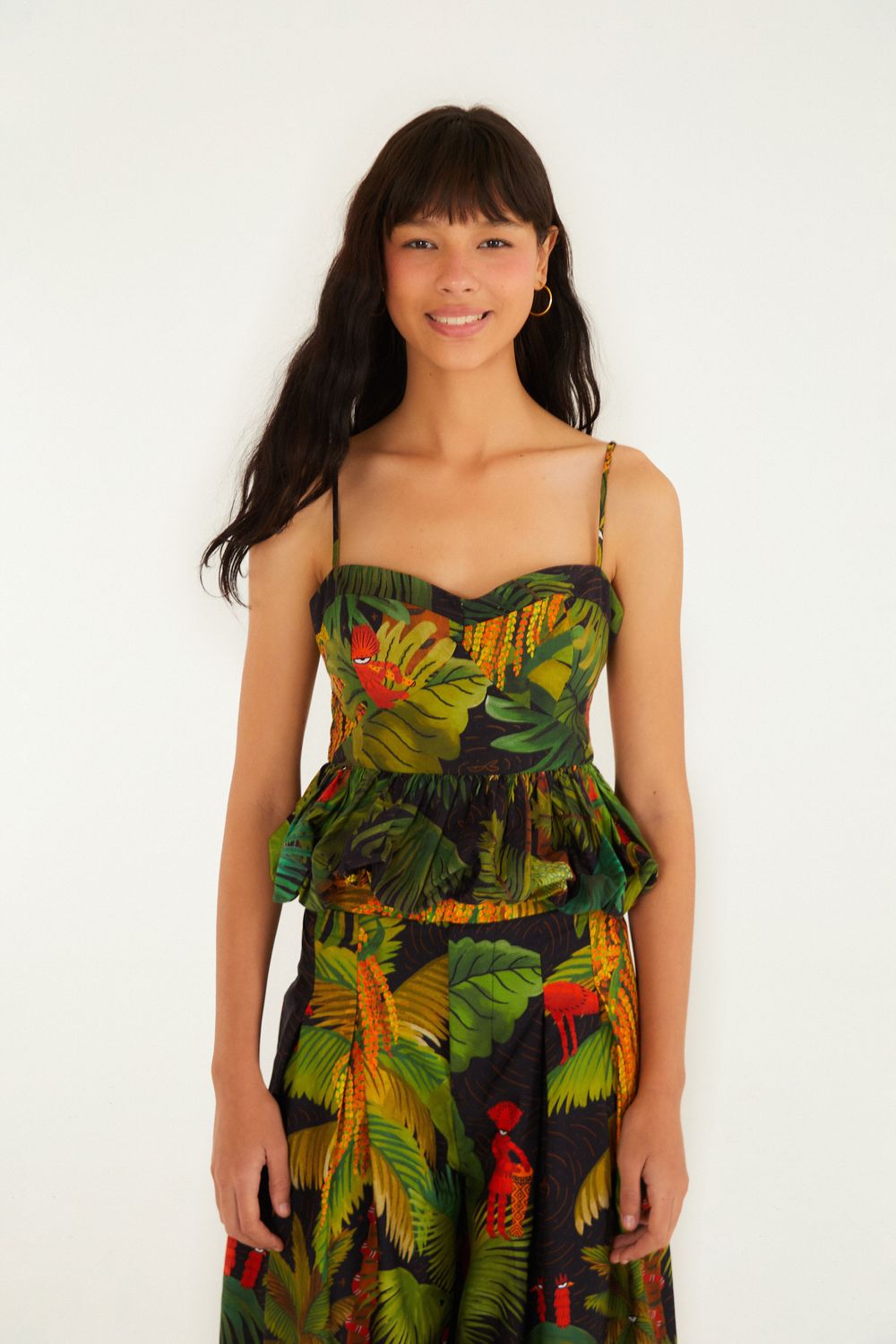 blusa balonê estampada enkantados. com alças ajustáveis e decote coração, este modelo eleva qualquer look com charme. o acabamento em babados adiciona um toque de movimento, enquanto a modelagem balonê confere um ar casual e descontraído. aposte em ocasiões leves e momentos de lazer. FARM RIO original - verão 26. este produto é um lançamento da coleção Amazônikas, que nasce do encontro entre o universo criativo da FARM Rio e a força artística do Norte do Brasil. quatro artistas visuais de diferentes regiões da Amazônia — Bonikta, P.V. Dias, Wira Tini e Astro Amazônico — expressam diferentes perspectivas em uma série de estampas desenvolvidas a partir de suas histórias e manifestações culturais. a estampa enkantados, co-criada com Bonikta, traz os seres inspirados nos encantados da Amazônia, que habitam e protegem a floresta. elas são figuras características do trabalho do artista, com olhar de expressão marcante que já viraram sua assinatura.-