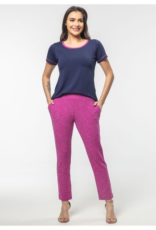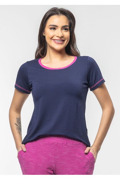 Malha Azul Marinho liso, com punho no decote e costura trançador nas mangas e barra na cor fúcsia.