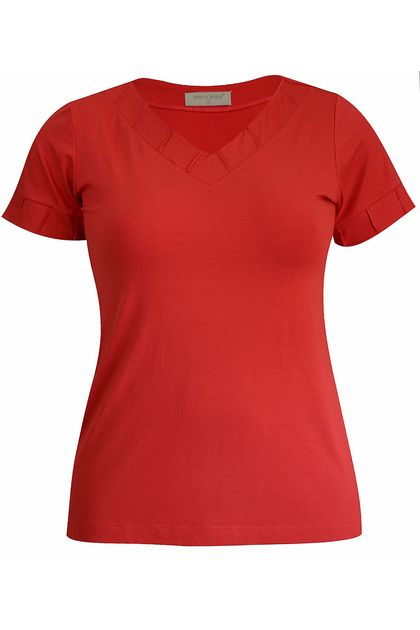Blusa com decote em "V", e mangas curtas compostos por detalhes de nervuras.