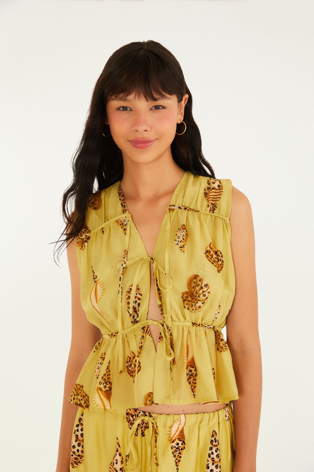 blusa concha pintada. decote em v com detalhe franzido que acrescenta charme à peça. modelagem solta e fluida, perfeita para proporcionar conforto, enquanto as camadas delicadas criam um jogo de movimento. ideal para um passeio à beira-mar ou encontro casual. FARM RIO original - verão 26.-