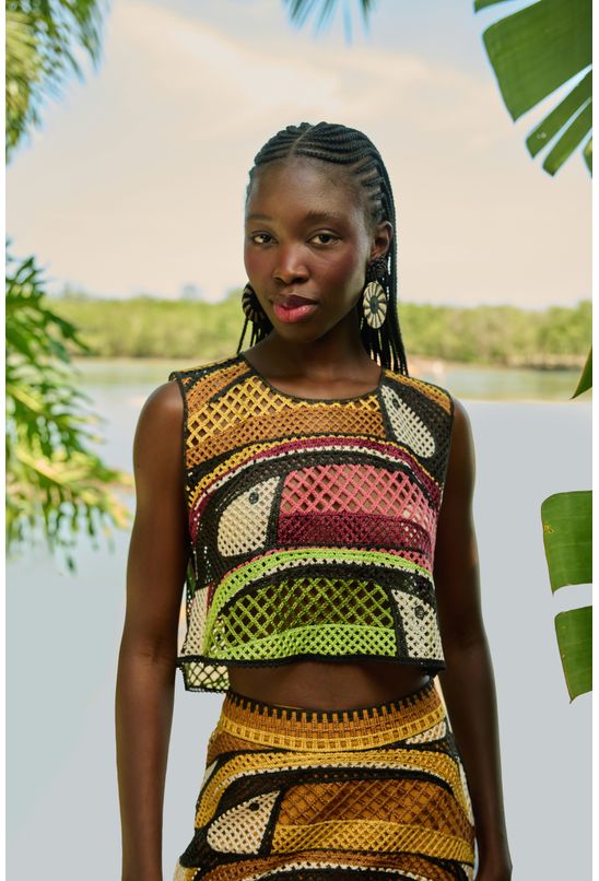blusa crochê estampada árvore de tucano. com corte reto e ombros à mostra, essa peça traz uma vibe casual e moderna. confeccionada em crochê leve e estampado, exibe detalhes intrincados que elevam o visual. a blusa é ideal para um almoço ao ar livre ou um passeio à beira-mar. FARM RIO original - verão 26.-