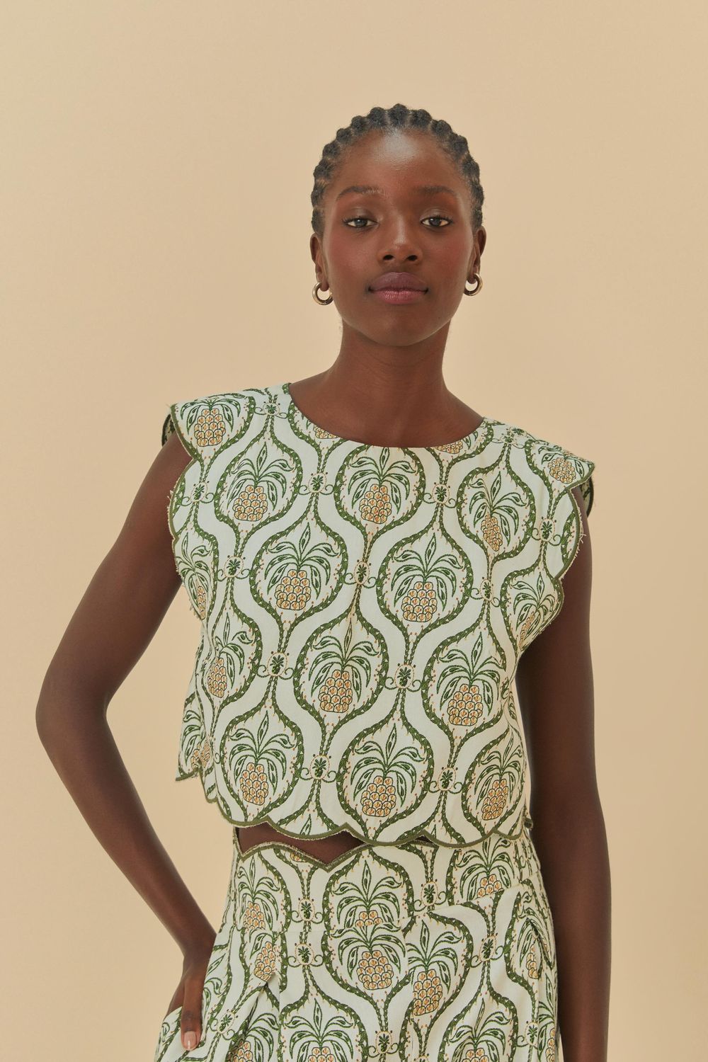 blusa cropped estampado brilho de abacaxi. com decote arredondado e cavas amplas, oferece conforto e frescor. a modelagem solta, em tecido leve e fluido, proporciona movimento natural, ideal para dias casuais e ocasiões especiais. eleve o seu look com esta peça exclusiva. FARM RIO original - inverno 25.-