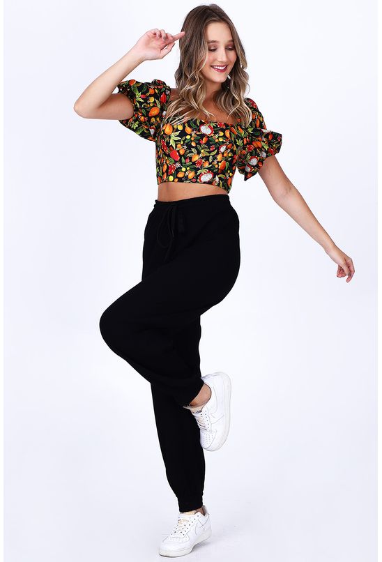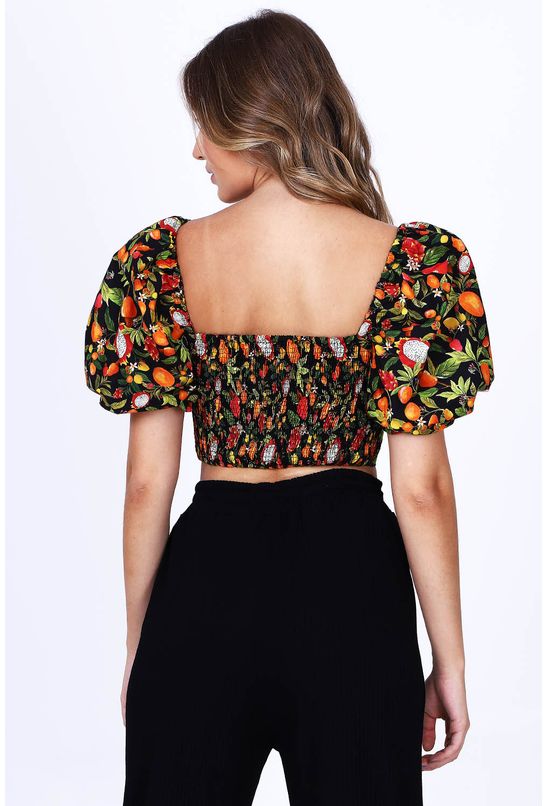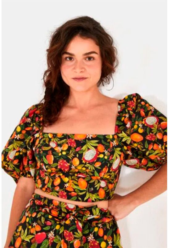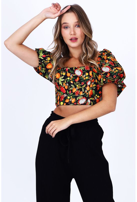 Blusa cropped mania de fruta, preta estampada, decote quadrado e manga curta bufante. Lastex posterior e elástico por todo o decote, facilitando o vestir e proporcionando conforto. *as peças podem variar de estampa e tonalidade.
