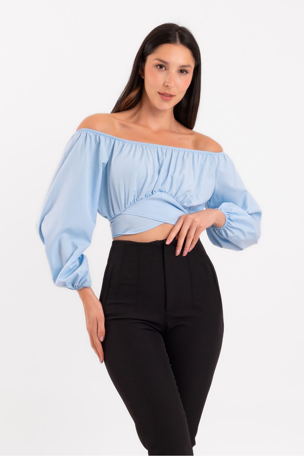 Blusa cropped ombro a ombro detalhe amarração cintura azul bebê babado