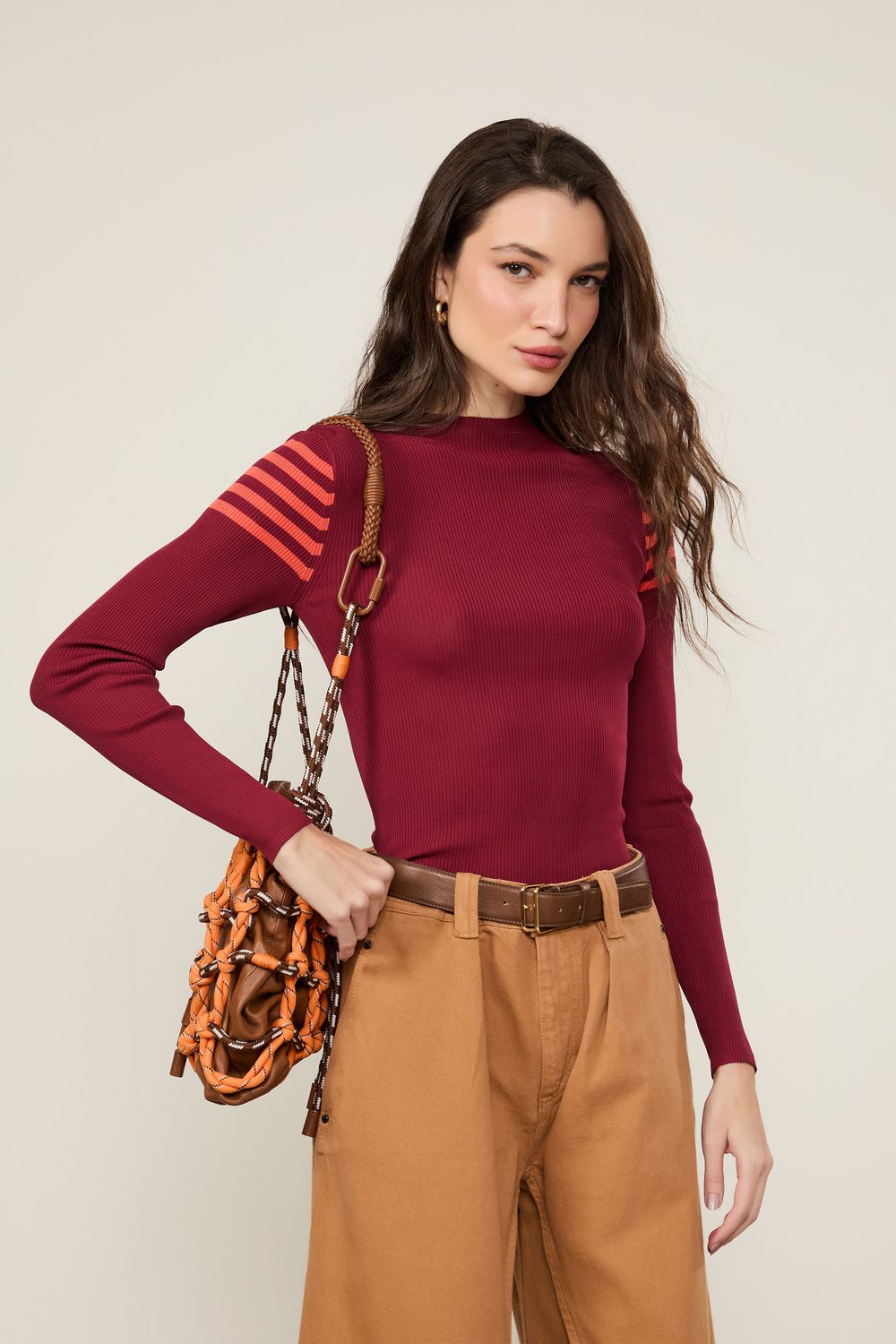 Blusa de Tricot canelado com mangas longas, decote alto, shape justo, comprimento clássico e detalhe listrado nos ombros. Uma proposta moderna e versátil para a estação.