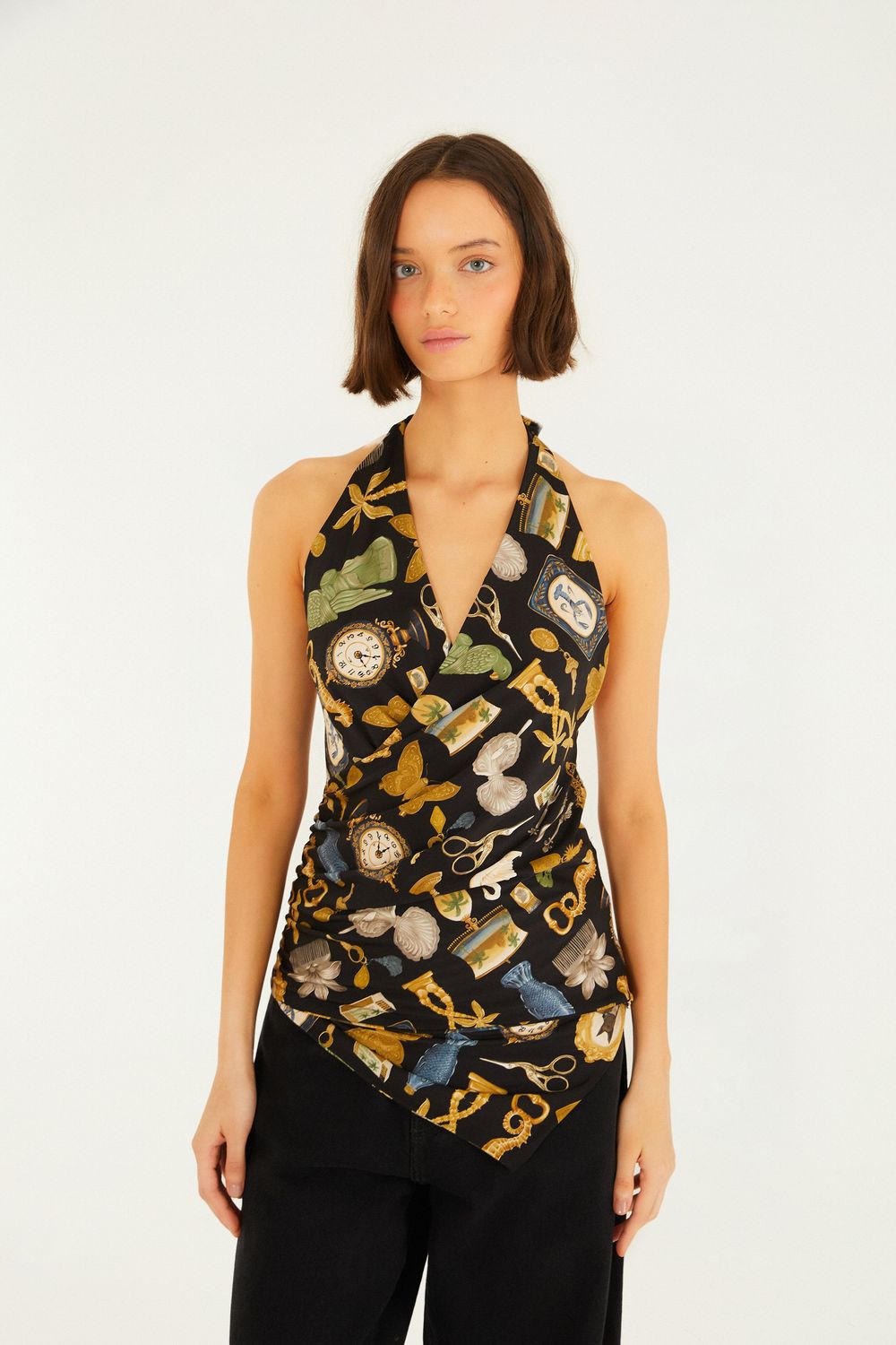 blusa degagê bibelô. com design inovador, esta peça é a definição de originalidade e estilo. seu decote transpassado valoriza o colo, enquanto as alças largas trazem conforto e segurança. o corte assimétrico confere um ar moderno, perfeito para ocasiões casuais ou eventos mais alinhados. FARM Rio, coleção Carioca - inverno 26.-