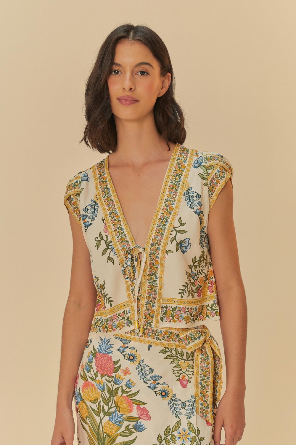 blusa estampada elisa traz leveza ao seu guarda-roupa com seu decote em v profundo e charmosas alças franzidas. confeccionada em tecido leve, possui amarração frontal que adiciona uma delicadeza única. perfeita para momentos casuais ou encontros especiais, ela é a peça que faltava para elevar seu estilo. FARM RIO original - inverno 25.-