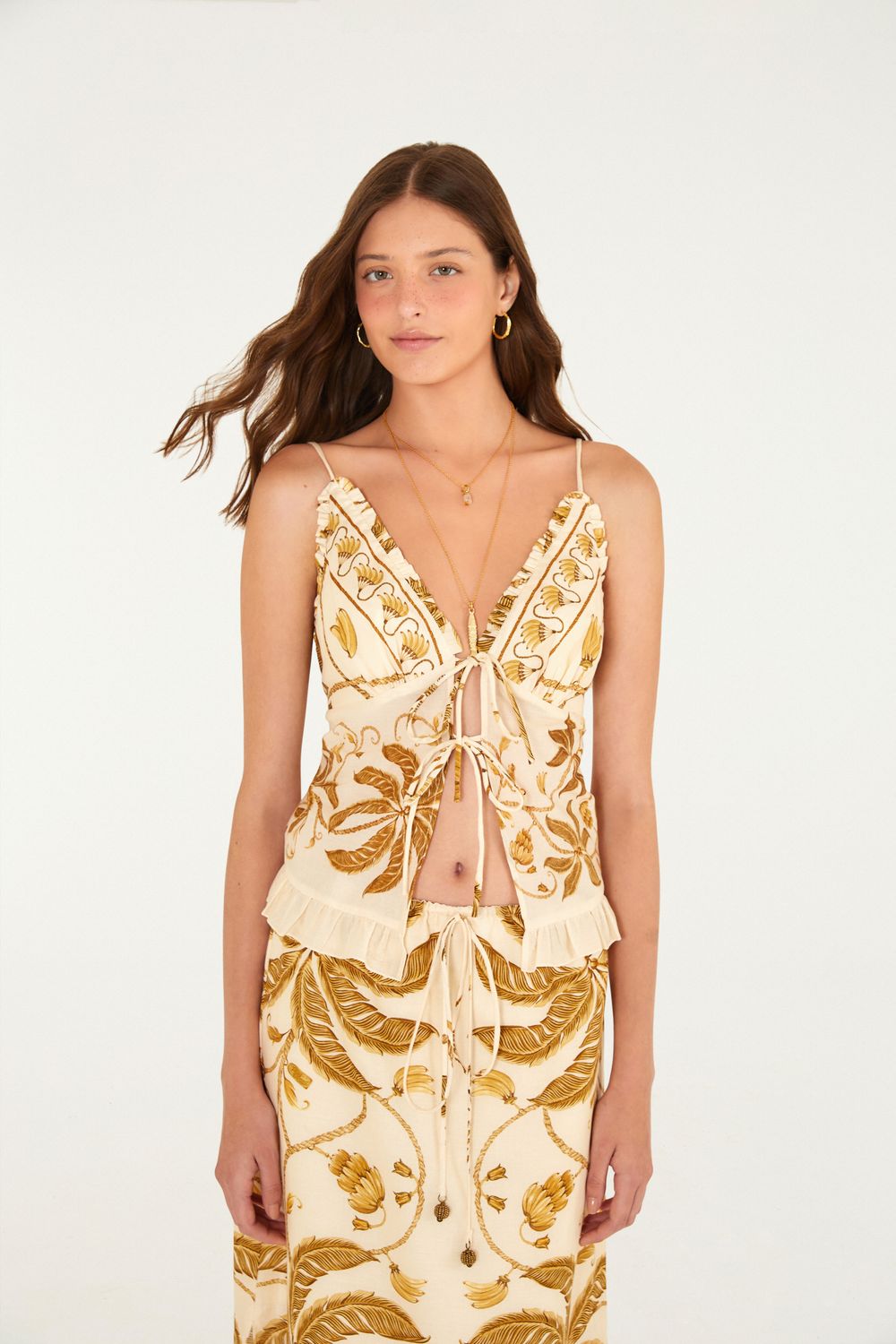 blusa estampada ourinho tropical. possui decote em v ajustável com amarração central que traz charme e leveza. suas alças finas garantem conforto, enquanto o bordado contrastante nas barras cria um visual único. perfeita para um encontro descontraído ou um passeio à tarde. FARM Rio, coleção Carioca - inverno 26.-
