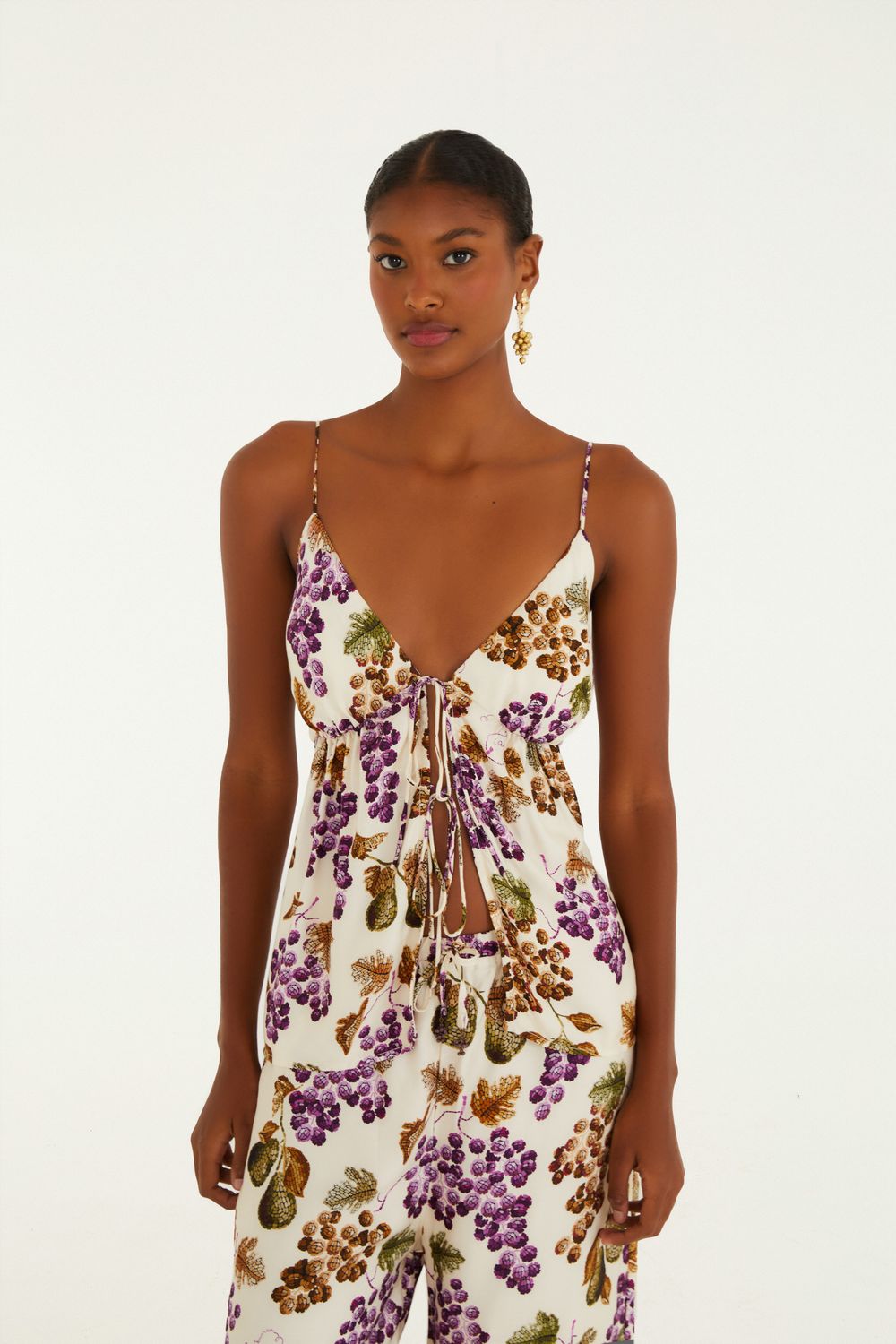 blusa estampada romance de uva. com alças finas e decote profundo ajustável com delicadas cordinhas, esta peça traz uma modelagem fluida e leveza para o seu look. ideal para momentos casuais, se destaca pela originalidade e charme inconfundíveis. perfeita para dias quentes que pedem estilo confortável e autêntico. FARM RIO original - verão 26.-