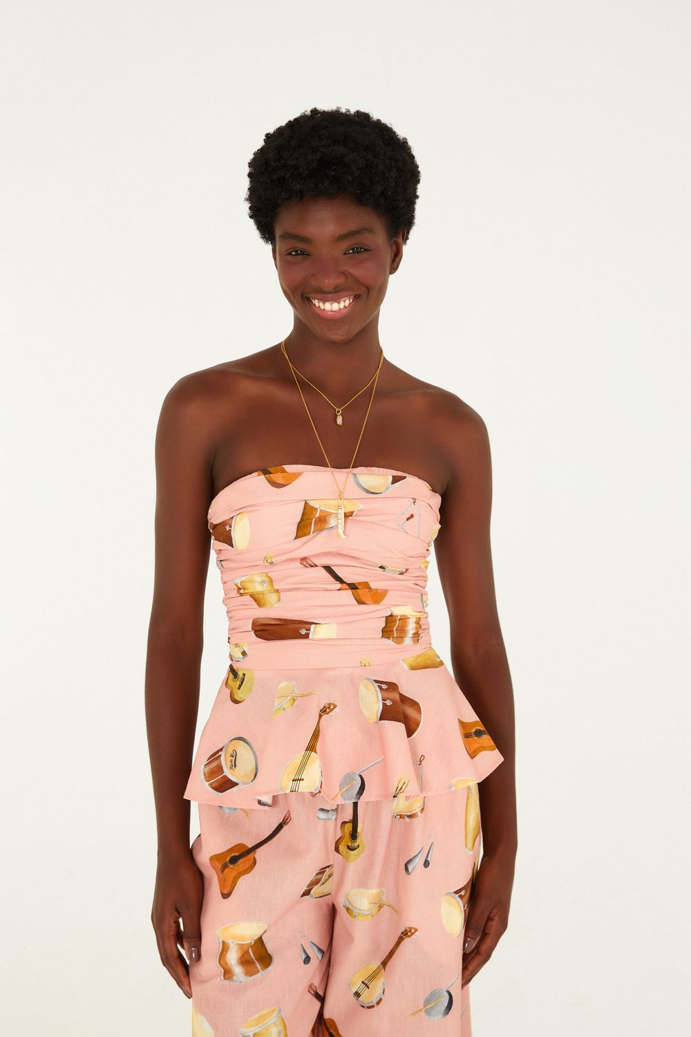 blusa estampada som do rio. traz um design sem alças com detalhes drapeados, valorizando um visual casual. o peplum sutil eleva o charme da peça, perfeita para um jantar ou encontros diurnos. confeccionada com tecido de toque macio, oferece conforto e estilo em qualquer ocasião. FARM Rio, coleção Carioca - inverno 26.-