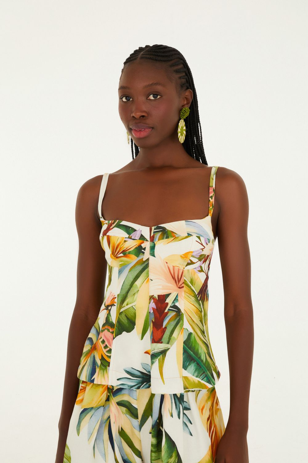 blusa estampada tropicália. com design casual e alças finas, essa peça traz um decote suave e botões centrais, garantindo charme atemporal. a modelagem é delicadamente ajustada ao corpo, permitindo conforto e estilo. perfeita para dias ensolarados, seja na cidade ou na praia. FARM RIO original - verão 26.-