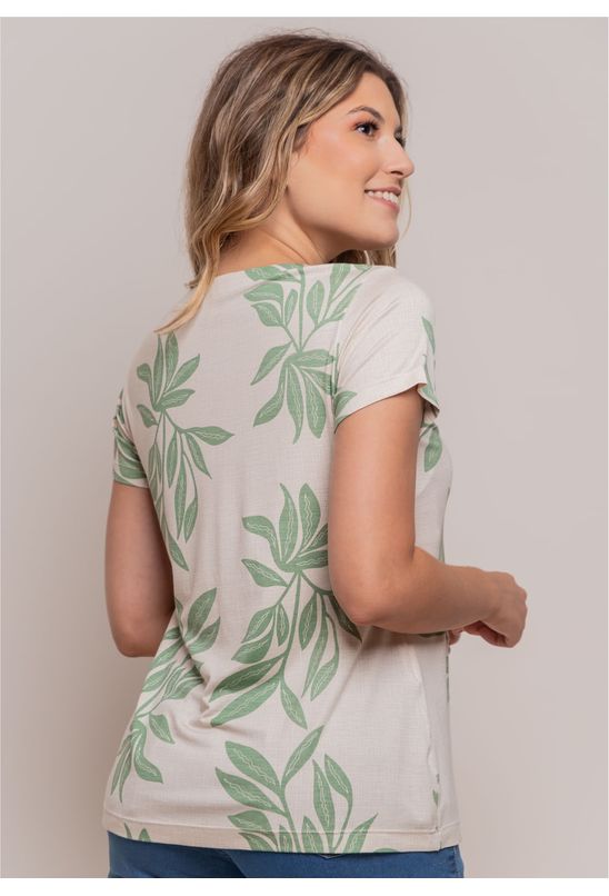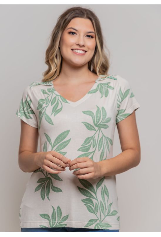 Blusa estampada em tons de verde, sobre o fundo na cor Bege .
