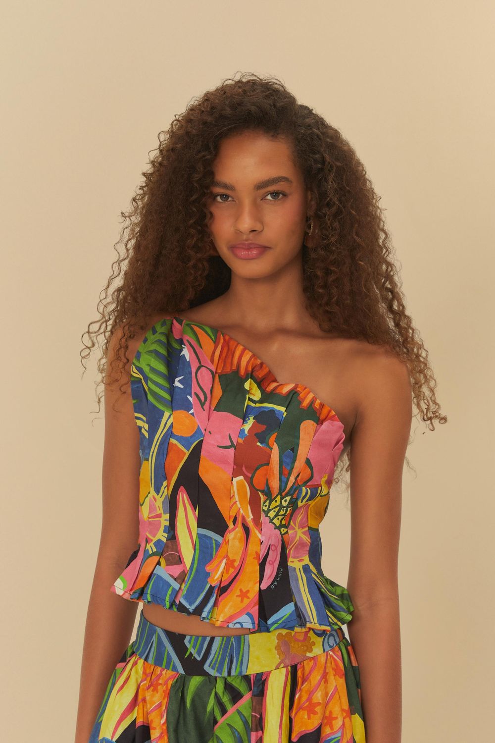 blusa fantasia. com design assimétrico e um elegante ombro só, é confeccionada em tecido leve que garante conforto e estilo. a barra com acabamento fluido adiciona movimento único à peça. perfeita para ocasiões casuais ou um evento especial, trazendo um toque de originalidade ao look. FARM RIO original - inverno 25.-