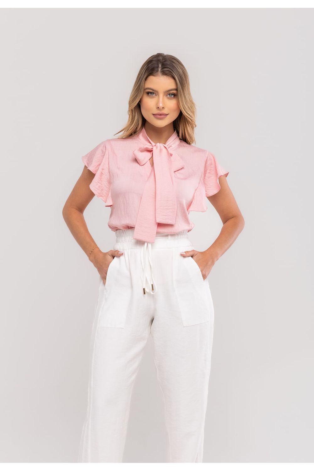 Blusa Feminina Com Laço na Gola e Manga Babado Rosa Salvatore