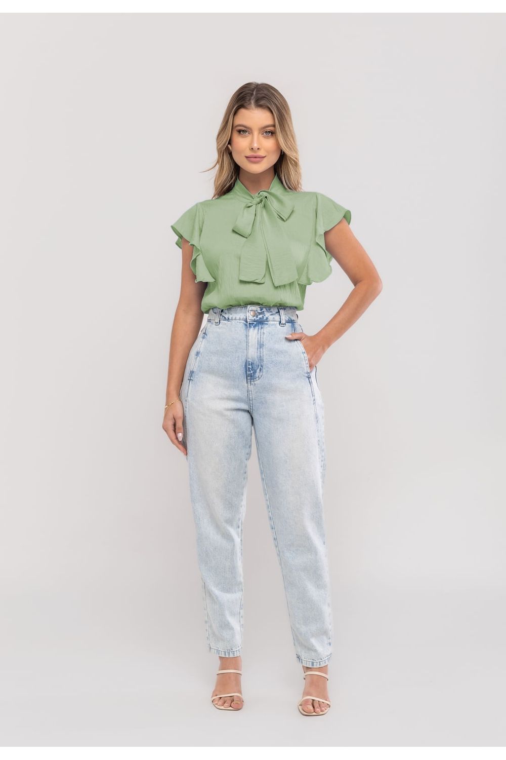 Blusa Feminina Com Laço na Gola e Manga Babado Verde Salvatore