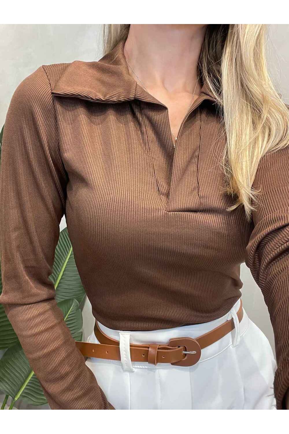 Blusa Feminina em Ribana Gola Polo Manga Longa Joana Ref. 1471 - Café - Único