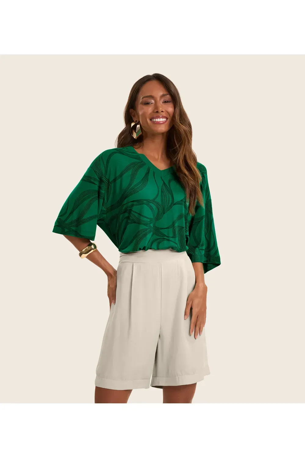 Blusa confeccionada em Viscotorcion, com caimento leve e confortável. Possui decote em "V" com acabamento em tecido contrastante e pesponto aparente, trazendo um toque moderno. Conta com estampa rotativa que garante um visual único em cada peça. As mangas e a barra têm acabamento com costura dupla, oferecendo melhor durabilidade. Ideal para quem busca estilo e praticidade no dia a dia.-