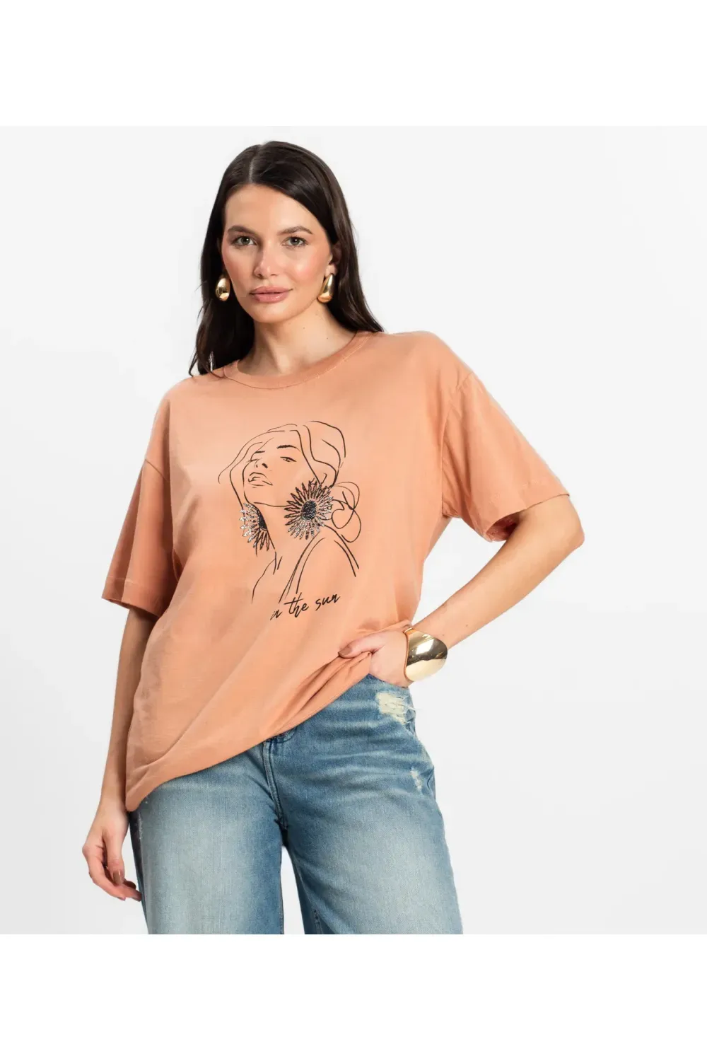 Blusa Feminina Manga Curta Rovitex, confeccionada em meia malha, com caimento leve e confortável. Possui gola com acabamento canelado e bainhas nas mangas e na barra com costura dupla reforçada. A estampa frontal traz um desenho moderno com aplicação de esfera e brilho foil, garantindo um visual atual e cheio de estilo. Ideal para compor looks casuais com personalidade.-