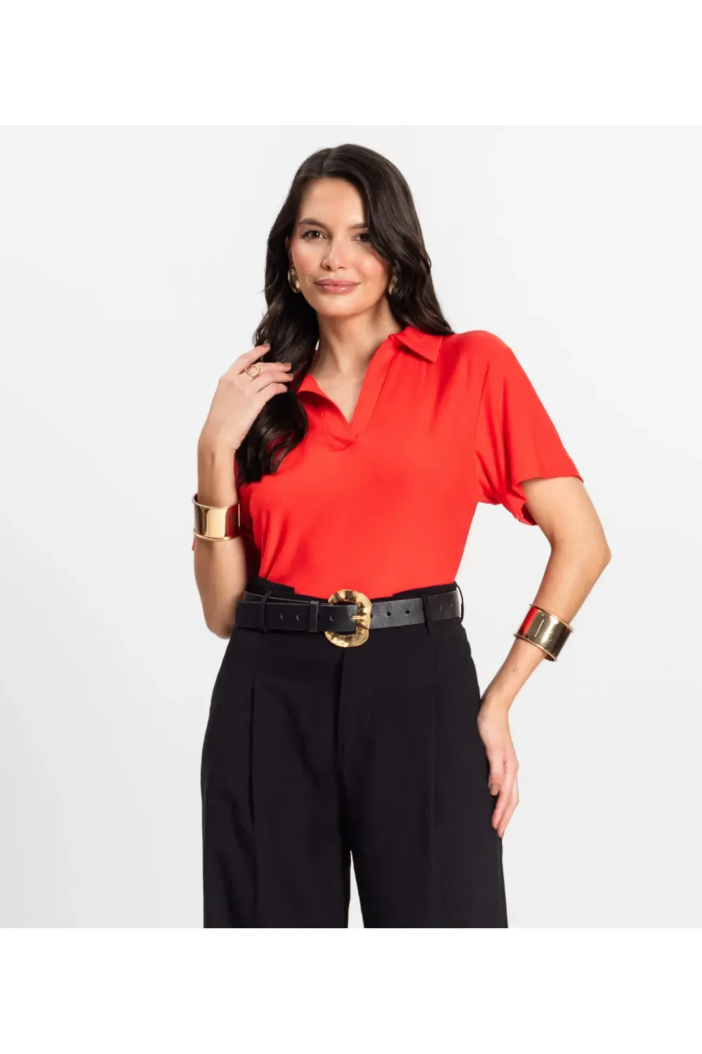 Blusa feminina manga curta Rovitex confeccionada em visco creponada, com toque leve e caimento fluido. Possui gola estruturada com acabamento reforçado em toda a volta, além de peitilho frontal com detalhe entretelado, dando um charme especial à peça. As mangas contam com acabamento duplo e a barra é levemente mais larga, trazendo firmeza e ótimo caimento. Ideal para compor looks modernos e confortáveis no dia a dia.-