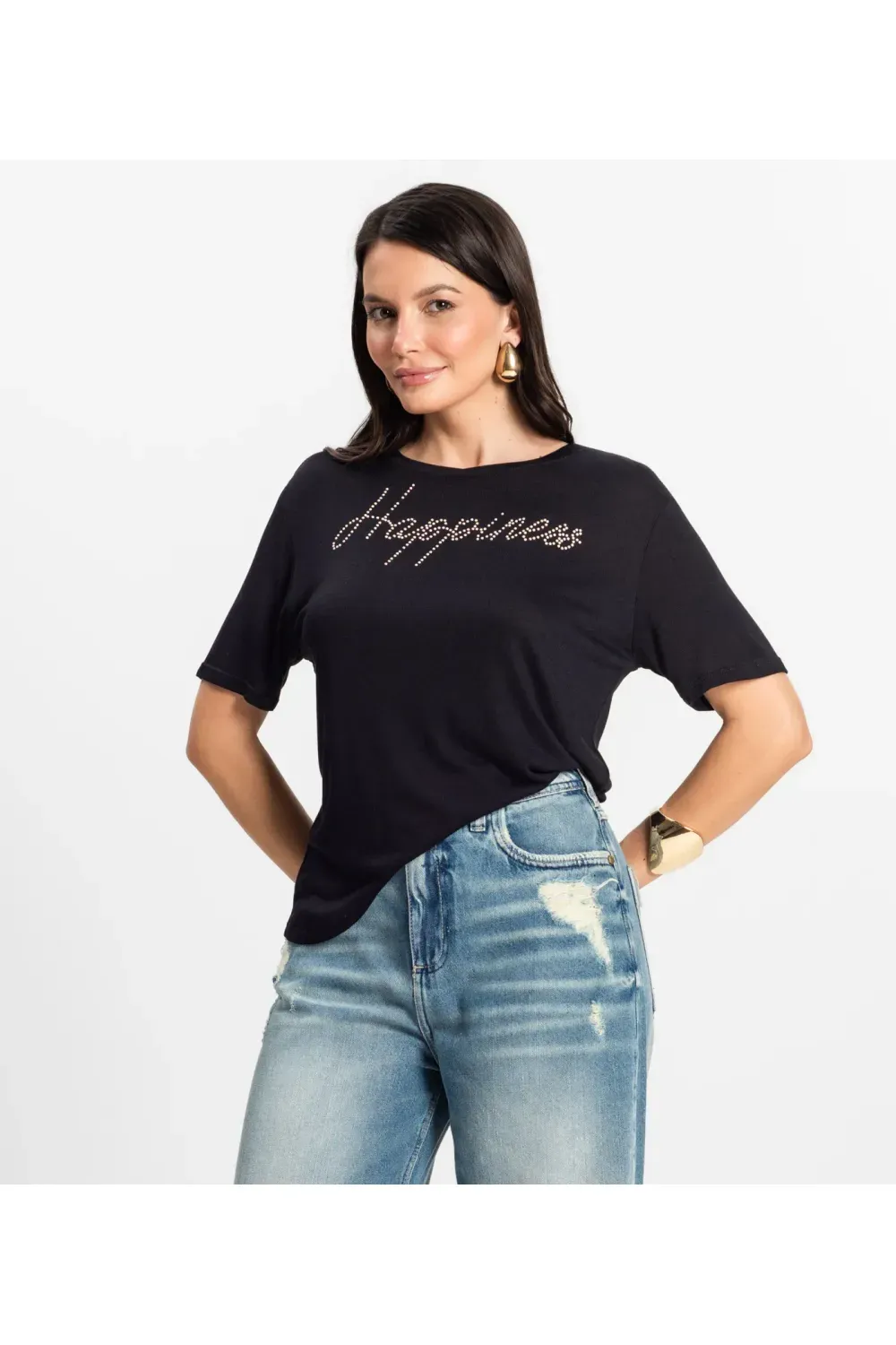 Camiseta Feminina Rovitex confeccionada em visco de tricot, leve e confortável. O modelo conta com aplicação de strass na parte frontal, trazendo um toque de brilho e delicadeza. As mangas e a barra possuem acabamento com bainha dupla, oferecendo um caimento mais ajustado e acabamento refinado. Ideal para compor looks casuais com estilo e praticidade.-