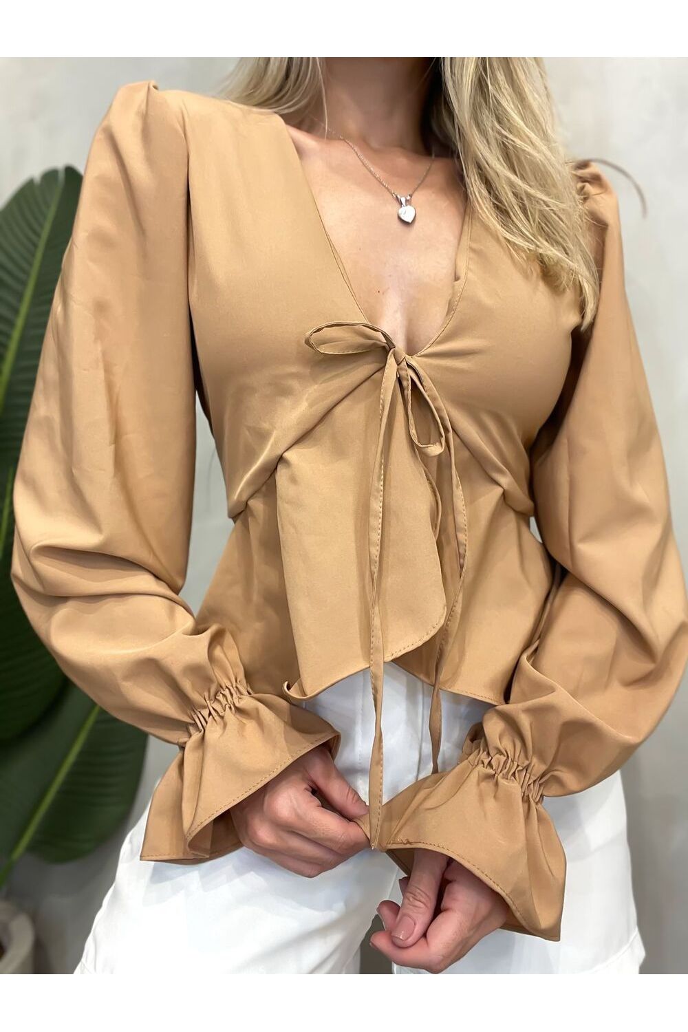 Blusa Feminina Manga Longa em Crepe Boho Chic com Amarração Luiza Ref. 1433 - Bege - Único