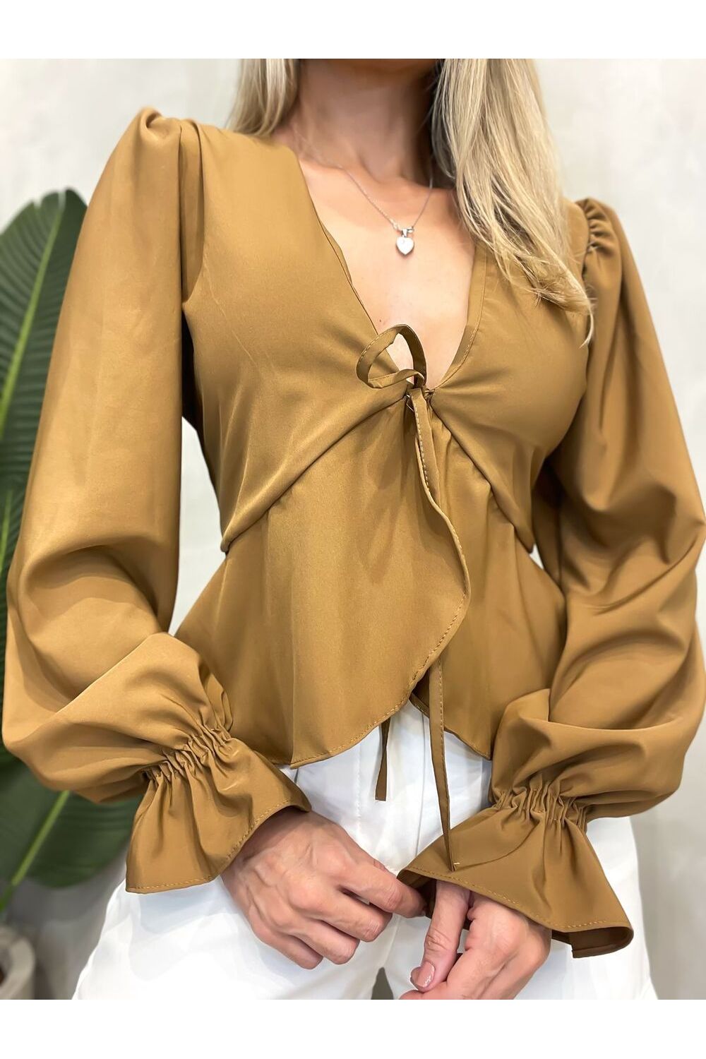 Blusa Feminina Manga Longa em Crepe Boho Chic com Amarração Luiza Ref. 1433 - Marrom - Único