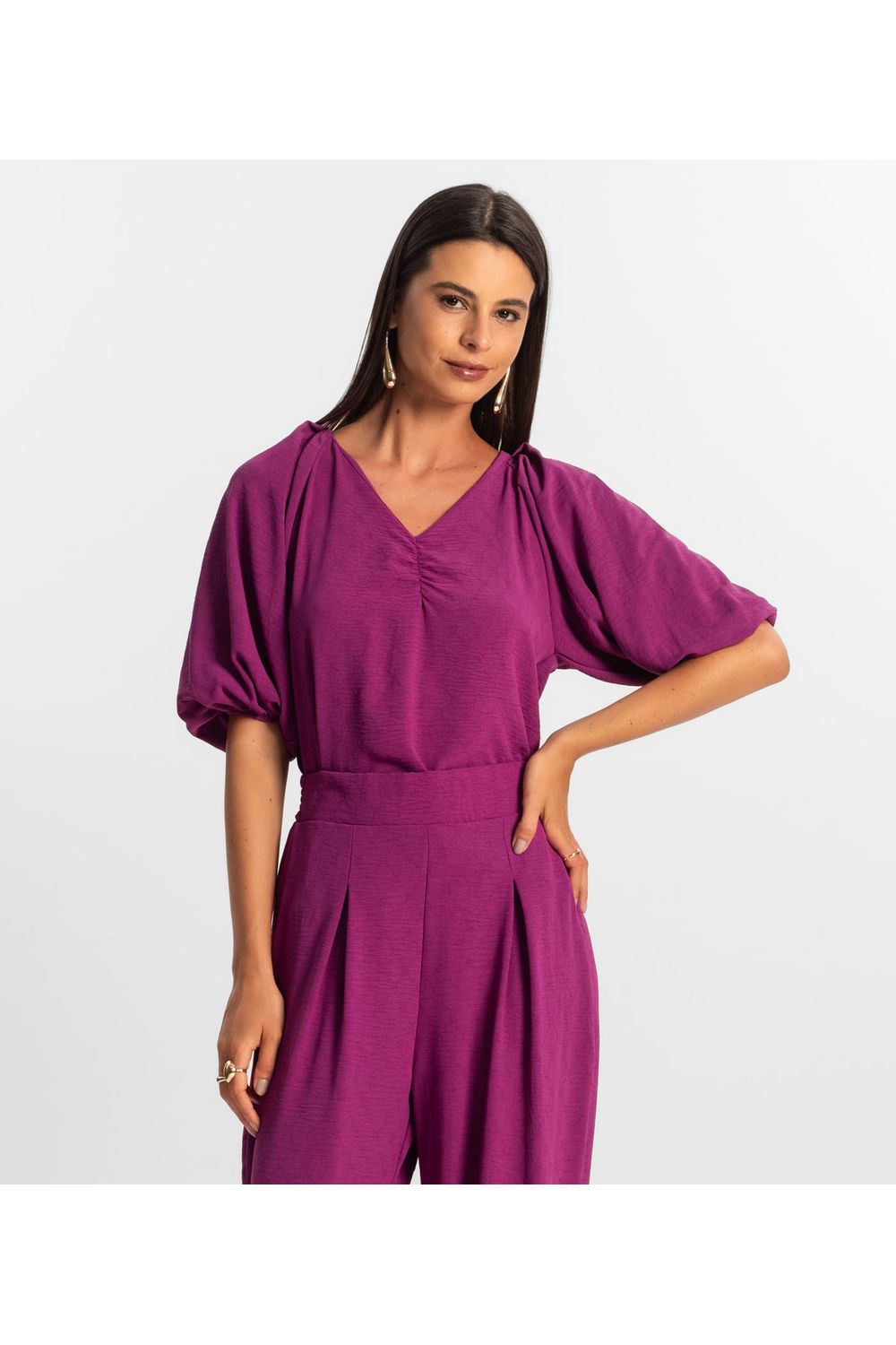 A Blusa Feminina Rovitex, confeccionada em Air Flow, oferece leveza e sofisticação para o dia a dia. Seu design delicado conta com decote V com franzido, que valoriza o colo e adiciona um toque feminino à peça. As mangas na altura do cotovelo com elástico na barra proporcionam um caimento confortável e charmoso, enquanto os franzidos na altura dos ombros conferem um detalhe sutil e elegante. Ideal para compor looks modernos e versáteis!-