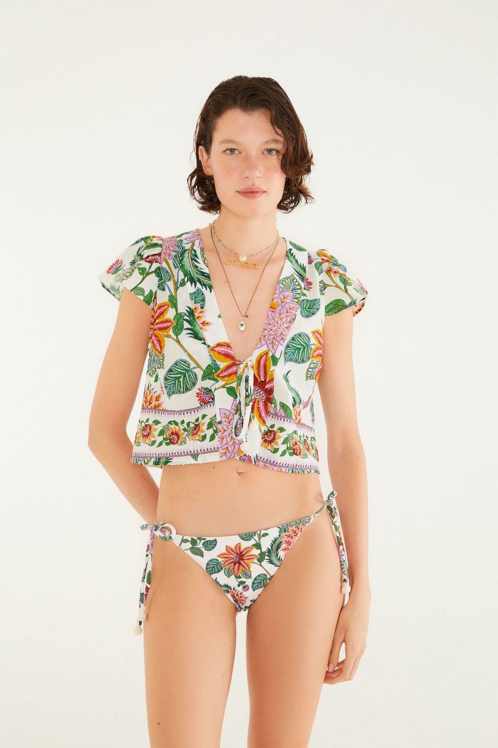 blusa floral delhi. com decote em v profundo e amarração no busto, essa blusa traz mangas curtas bufantes que adicionam um toque charmoso à peça. confeccionada em tecido leve e fluido, é ideal para um dia casual ou um passeio ao ar livre. a estampa floral eleva o visual, criando uma peça única e cheia de estilo. FARM RIO original - alto verão 26.-