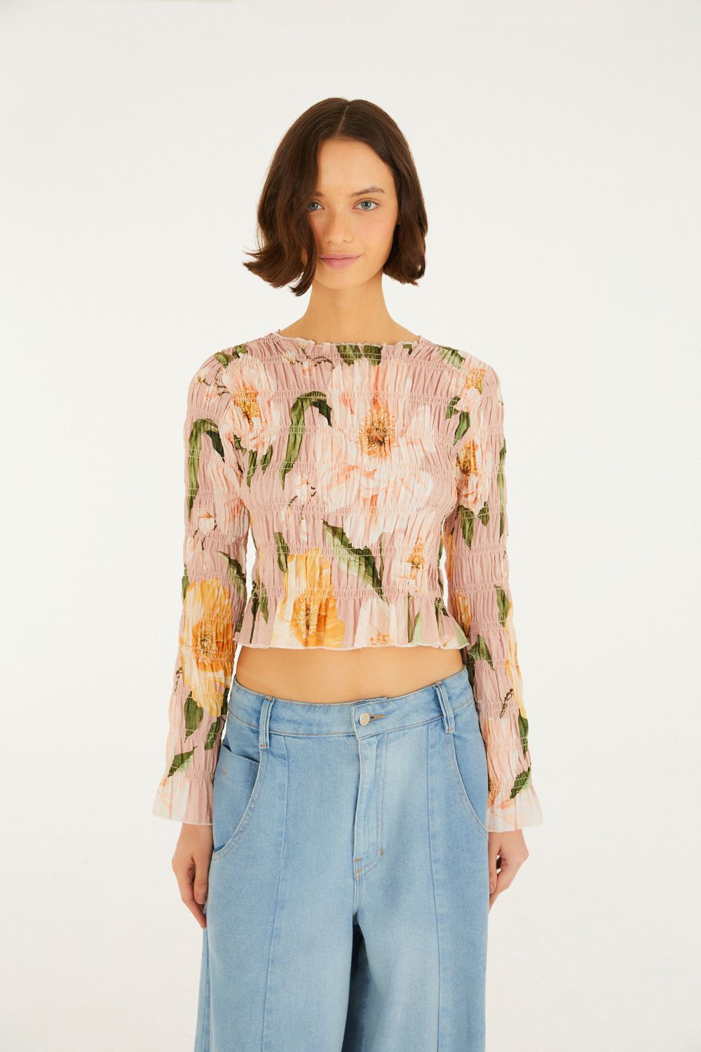blusa lastex floral lola. com um toque único, sua modelagem ajustada combina com o tecido floral, criando um visual charmoso. o decote redondo e as mangas longas garantem conforto e estilo. perfeita para ocasiões casuais ou encontros especiais, a peça traz um frescor encantador ao seu guarda-roupa. FARM Rio, coleção Carioca - inverno 26.-